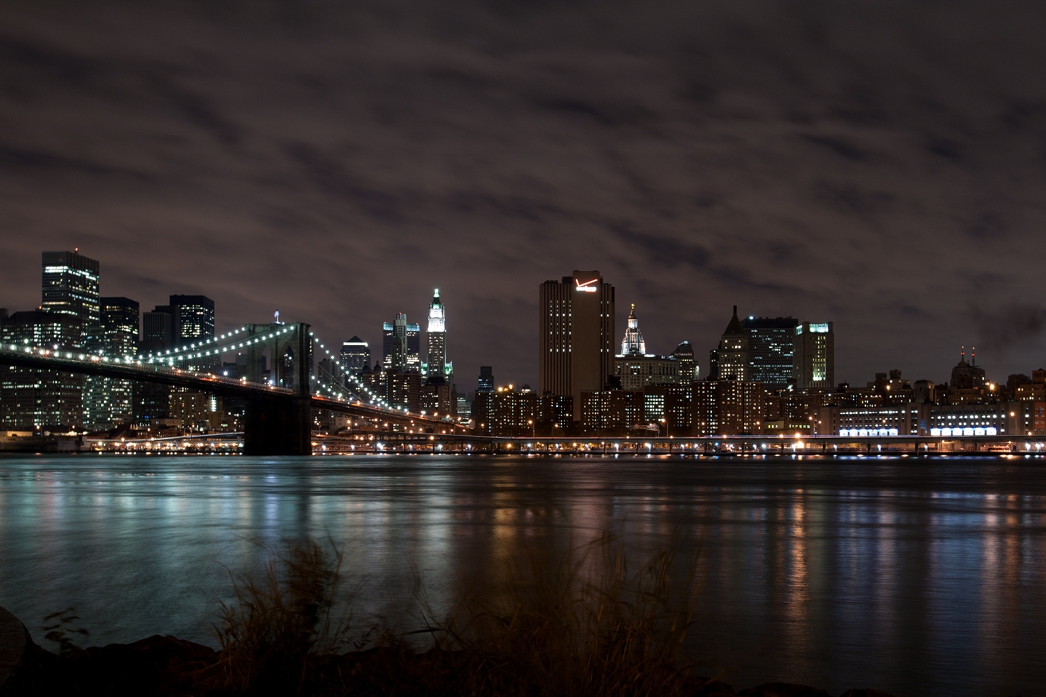 Bei dichtem Gedränge in der U-Bahn fuhren wir anschließend unter der Brooklyn Bridge hindurch ans andere Ufer des East Rivers. Die Leute fahren augenscheinlich morgens zur Arbeit nach Manhattan und abends zurück nach Brooklyn oder Queens. Am anderen Ufer war wenig los und die alten Industriegebäude, Kopfsteinpflaster, das man in New York nur noch selten sieht, und der Blick auf die Manhattan Bridge erinnern an Szenen aus „Es war einmal in Amerika“. Wir gingen unter der Manhattan Bridge hindurch zur Brooklyn Bridge, wo sich der Brooklyn-Bridge-Park befindet, von dem man eine grandiose Sicht auf Downtown Manhattan hat; die World Trade Center fehlen allerdings als markante Spitze. Da ich kein Stativ besitze und mich nicht traute, den zufällig neben mir stehenden Fotografen zu fragen, ob er mir seins leiht, musste ich meine Kamera notdürftig auf einem Felsblock abstellen, um genügend Belichtungszeit zu bekommen.