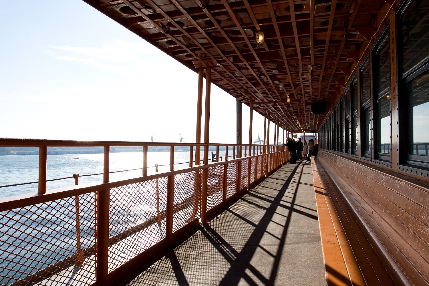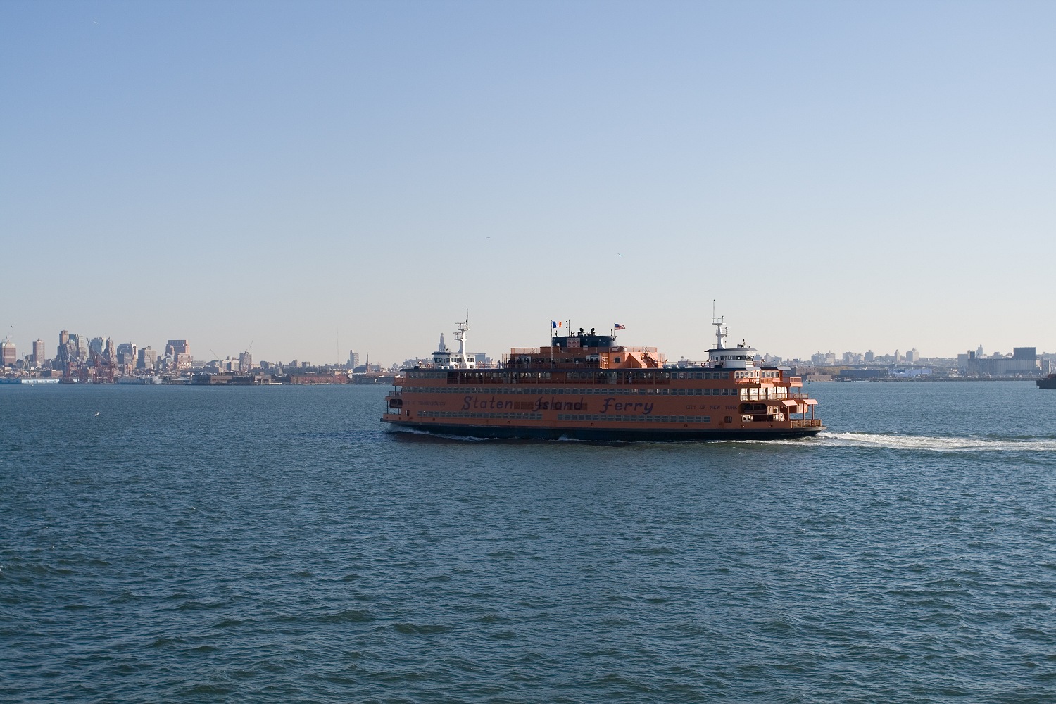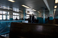 Auf Staten Island angekommen, liefen wir durch den Ausgang und einmal um die innere Halle herum, um wieder auf die Fähre zu gelangen. Auf der Insel gibt es schließlich nichts, was uns reizte. Die Fähre war mittlerweile voller geworden, es gab aber immer noch viele freie Plätze. Ich will gar nicht wissen, wie viele Passagiere bei Feierabendbetrieb auf die Fähre passen (müssen).