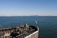 Das herrliche Wetter wollten wir nutzen und eine Fahrt mit der Fähre Richtung Ellis Island wagen, um die Freiheitsstatue zu sehen. Als wir mit der U-Bahn die Station der Staten-Island-Fähre erreichten, mussten wir noch ein paar hundert Meter hinter uns bringen, um zur Fähre zu gelangen. Unterwegs konnten wir vom Ufer aus die Freiheitsstatue und Ellis Island erblicken. An der Anlegestelle stellten wir dann aber fest, dass wir pro Person zwölf Dollar zahlen müssten. Das war uns zu doof. Wir gingen also zurück, um mit der Staten-Island-Fähre zu fahren, die keinen Cent kostet.