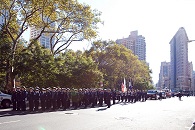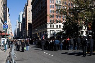 Zu Füßen des Flatiron Buildings gerieten wir in eine Militärparade, denn es war Veteran's Day. Wir beobachteten das bunte Treiben für eine Weile und gingen dann bei McDonald's etwas essen. S. waren die in der Tat schäbigen Hamburger zu eklig, weshalb sie sich kurze Zeit später in einem Deli mit leckerem Essen versorgte. Hätten J. und ich es doch nur ebenso getan. Als sie an der Kasse nicht wusste, wie viel sie bezahlen sollte und wie, half ihr ein Kunde hinter ihr: „You take one of these ... put your food in ... then you give it to the cashier and pay an incredible amount of money.“ Jener lässige Kerl war für S., wie sie später sagte, der New Yorker schlechthin. Beim Weitergehen rempelte ich versehentlich einen Mann an und fing mir spottendes Gelächter von S. und J. ein, als ich reflexartig um deutsche „Entschuldigung!“ bat.