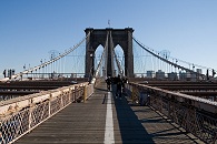 Auf der Brooklyn Bridge war Hochbetrieb. Ich kaufte mir bei einem Verkäufer auf der Brücke eine Flasche Poland Spring für unterwegs und beging nach wenigen hundert Metern den Fehler, nach unten zu blicken. Unter den mir viel zu dünn erscheinenden Holzbalken ging es rund 40 Meter in die Tiefe. Von da an zitterte ich jedes Mal, wenn ich nach einem meiner vielen Fotos die Abdeckklappe wieder auf das Objektiv setzen wollte. Wäre sie mir heruntergefallen und zwischen einer der Ritzen verschwunden, hätte ich sie niemals wiedergesehen. Die Brücke ist 1834 Meter lang und wurde von dem Deutschstämmigen John August Roebling konzipiert, der im thüringerischen Mühlhausen geboren wurde. Bei Vermessungsarbeiten quetschte er sich seinen Fuß und büßte die verletzten Zehen ein. Da er medizinische Behandlung ablehnte und seine eigene Heiltherapie darin bestand, ständig Wasser über die Wunde zu gießen, starb er kurze Zeit später an einer Tetanusinfektion.
