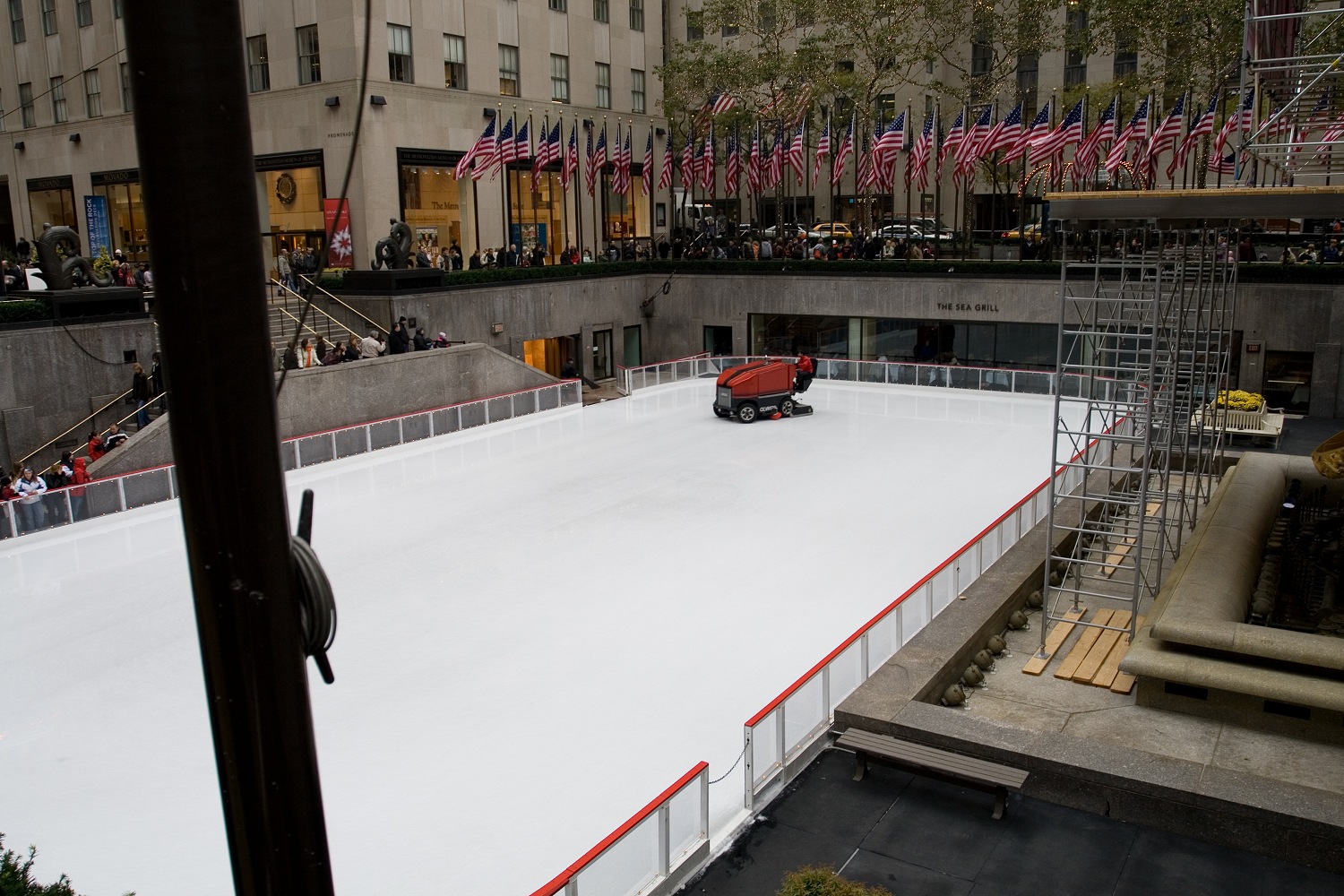 Mittlerweile hatten wir Ideen, wie der Tag für uns weitergehen sollte. J. und ich wollten gerne ins Museum of Modern Art, das MoMA, was S.' aber zu teuer war. Sie wollte lieber Klamotten kaufen gehen. Unsere Wege trennten sich vor dem H&M am Rockefeller Center. Leider mussten J. und ich angesichts der Schlange vor dem MoMA feststellen, dass es wenig Sinn machte, an diesem Tag das MoMA zu besuchen. Wir liefen daher schnell zu H&M zurück und hinderten S. daran, in Kauflaune zu geraten. Unsere Pläne verschoben wir auf Mittwoch. Wir gingen zurück und beobachteten die Eislaufbahn auf dem Rockefeller Plaza, die gerade präpariert wurde. Als ich das Rockefeller Building von unten aus fotografieren wollte, wurde ich von einem studentisch aussehenden Kerl mit Rockefeller-Pulli angesprochen: „You can take your pictures from the Observation Deck, if you like!“ — „Thanks, but I'll be there in a few days anyway.“ — „That's great! See you then!!“