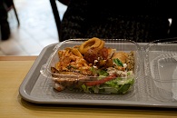 Wir fuhren weiter zum Financial District, gingen aber vorher noch ein paar Delis essen. In dem Geschäft wurde das halbe Kilo Delis vom Buffet ab 15 Uhr für 3,99 statt 5,49 Dollar verkauft. Es war 14.58 Uhr. Wunderbar! Zur Sicherheit warteten wir noch fünf Minuten und stürzten uns dann auf das fettige Essen. Ich kapitulierte bald und verteilte meine Reste an J. und S. Nach einer kurzen Verdauungspause gingen wir runter zur Wall Street, an deren Spitze die schöne Trinity Church steht. Darin probte ein Orchester und ich glaubte, „Atmosphères“ von György Ligeti zu erkennen.