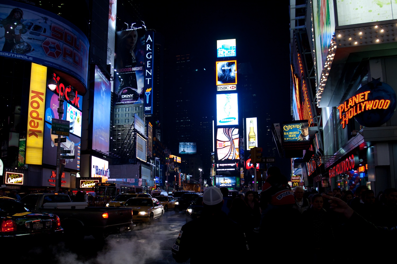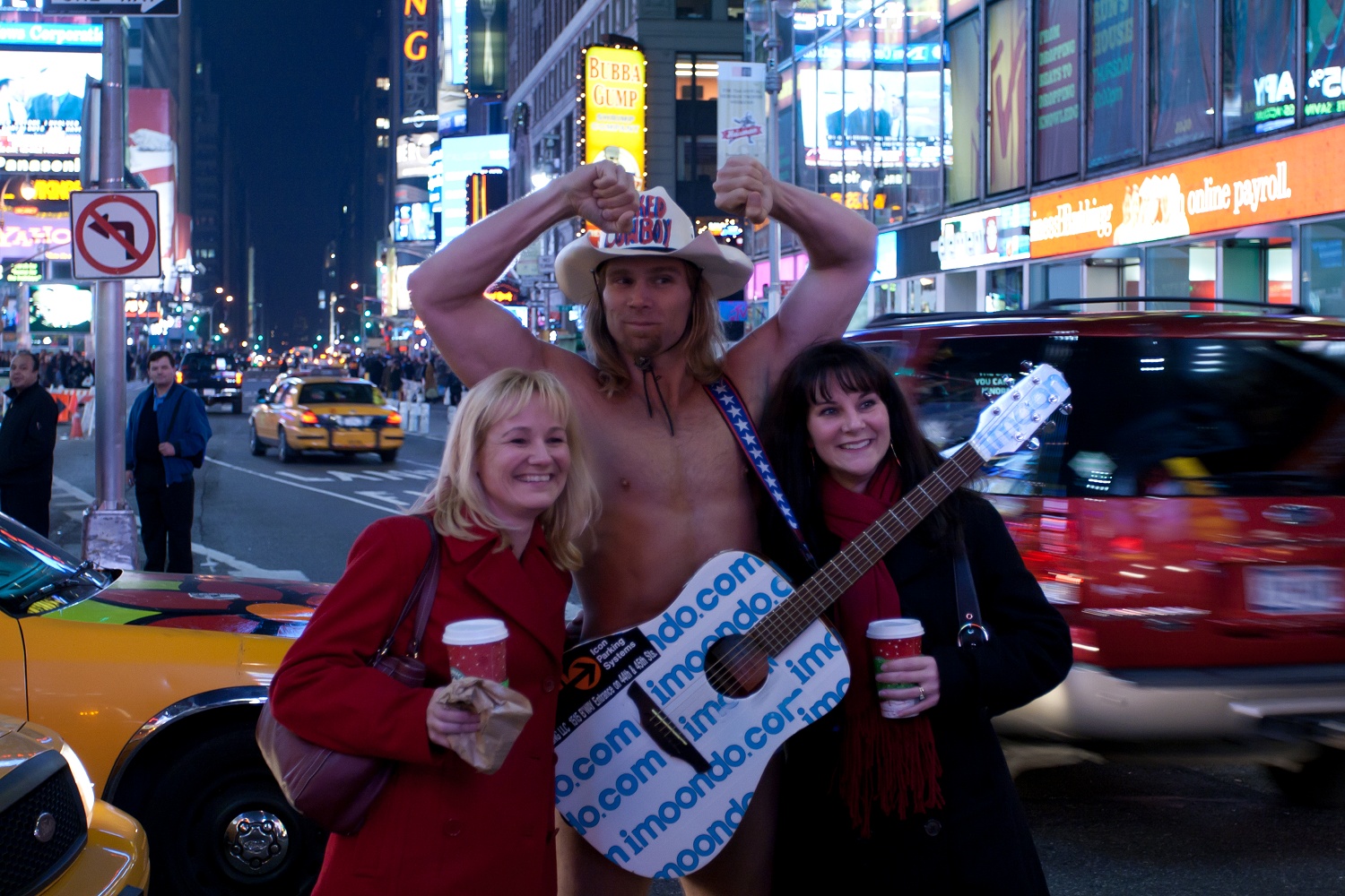 Als es zu unserer Herberge gehen sollte und wir wie üblich den Times Square überquerten, wurden wir überrascht, denn er war an jenem Abend da. Schon aus der Ferne sah man ihn auf der Verkehrsinsel stehen und konnte ihn singen hören, „hey-ho, I'm the Naked Cooowboy!“ S. und ich sahen ihn uns aus der Nähe an. J. war das zu doof, er wartete lieber am Straßenrand auf uns. Später freute er sich dafür umso mehr, als er dieses Video sah, das S. mit ihrer Kamera aufnehmen konnte. Cowboy-Overkill! Der Naked Cowboy, der aussieht wie Miles O'Keeffe, lockte spielend Passanten an — etwa ein leicht bekleidetes Mädchen mit den Worten „Baby, you're not wearing any clothes!?“ —, ließ sich mit ihnen ablichten und verlangte pro Foto zwei Dollar. Im Nachhinein bereue ich es, ihm kein Geld in seine Stiefel gesteckt zu haben. Wir drei und der Naked Cowboy, hätte ich mir das an die Wand hängen können? Dass er bei jener Temperatur diese Vorstellung bot, bewies Größe und Humor. Im Vordergrund also der Naked Cowboy und ein vorübereilender Rabbiner, im Hintergrund der bunte Times Square und viele Taxis. Das ist New York! Leider sollten wir den Cowboy in den nächsten Tagen nicht wiedersehen — vermutlich hatte er sich erkältet.