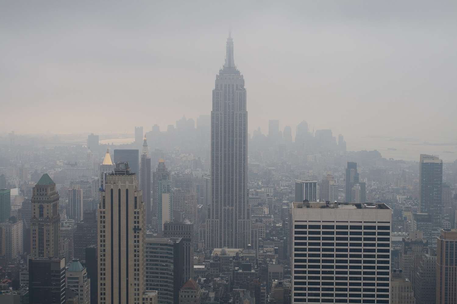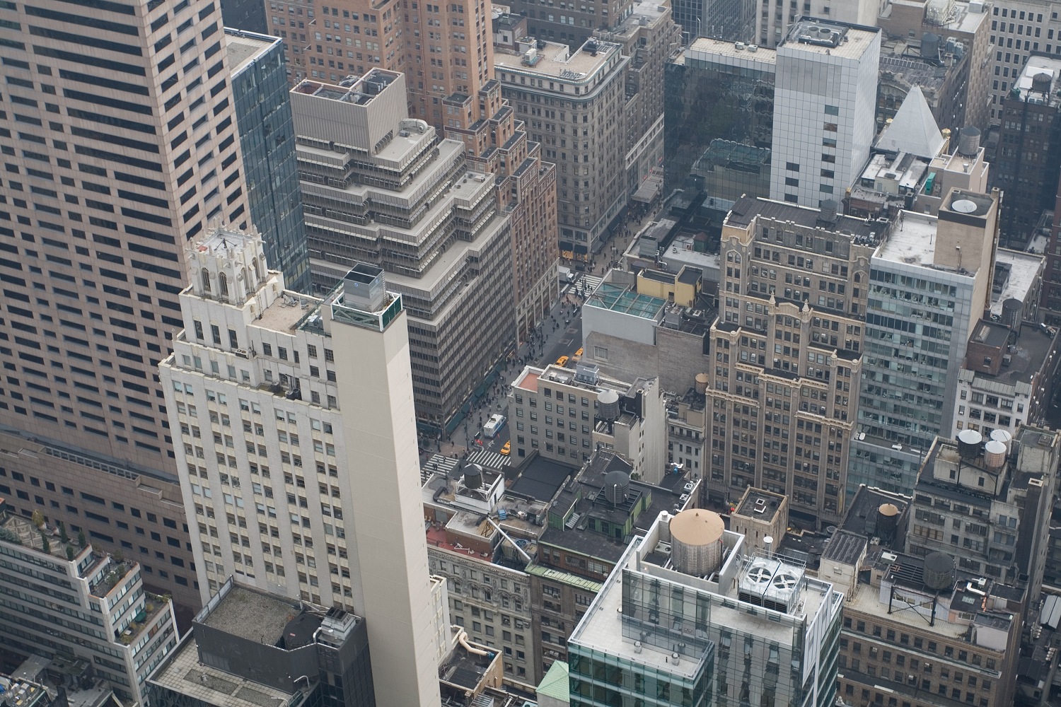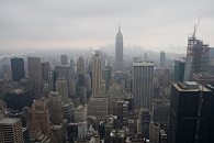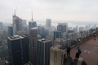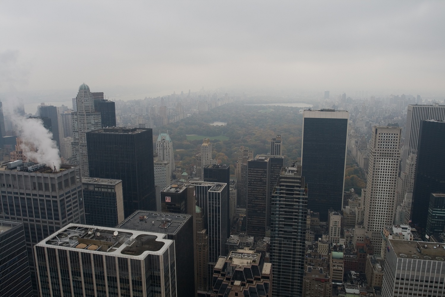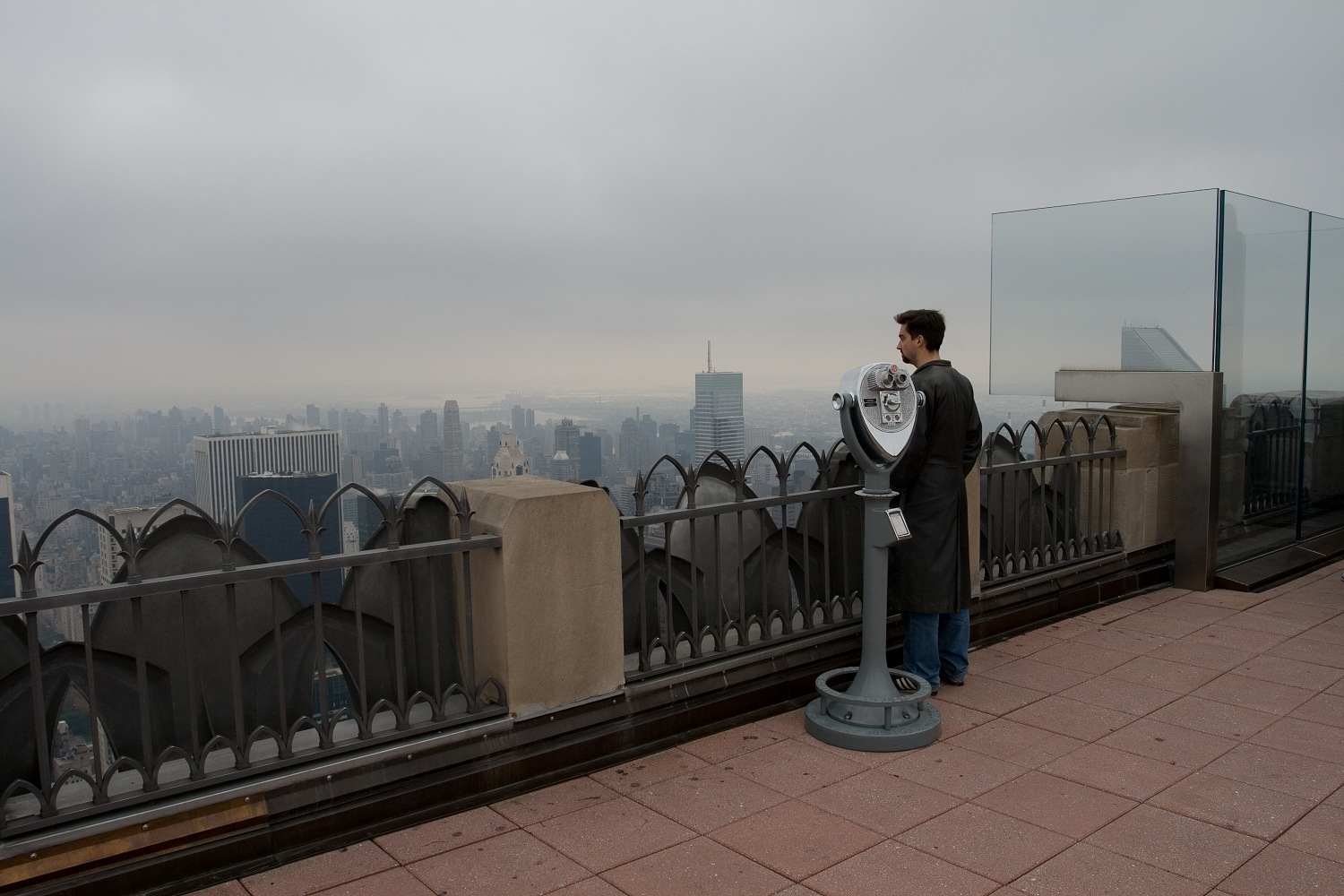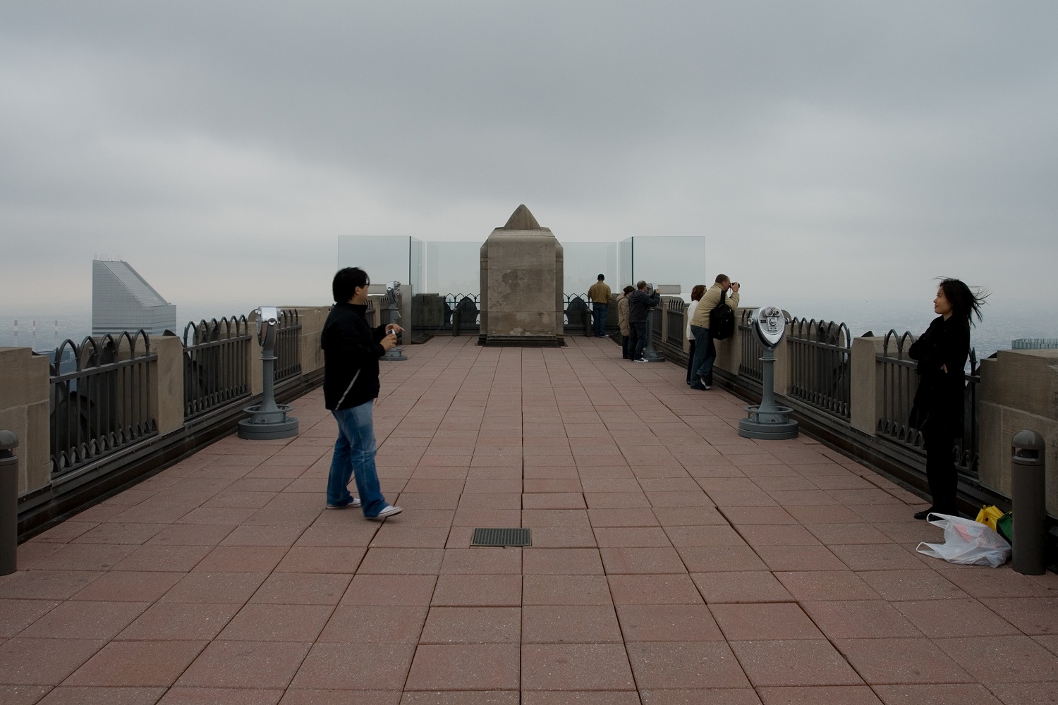 Nach einem kurzen Film über die Entstehungsgeschichte des Komplexes fuhren wir mit dem Fahrstuhl nach oben. Er hatte eine gläserne Decke und erlaubte uns einen spektakulären Blick ins Innere des Fahrstuhlschachtes. Die Fahrt kam mir langsamer vor als sie tatsächlich war. Der Horizont war leider etwas nebelverhangen, aber für einen Eindruck über New York bei Tag reichte es. In unserer Herberge hatte man uns das Rockefeller Building im Gegensatz zum Empire sehr ans Herz gelegt, und tatsächlich, die Sicht von hier oben war grandios. Man kann den Central Park überblicken, was vom Empire aus nur schwer möglich ist. Dazu ist das Observation Deck doppelstöckig und bietet mehr Besuchern Platz als die vergleichsweise schmale Plattform des Empires.