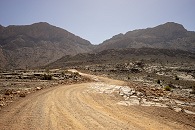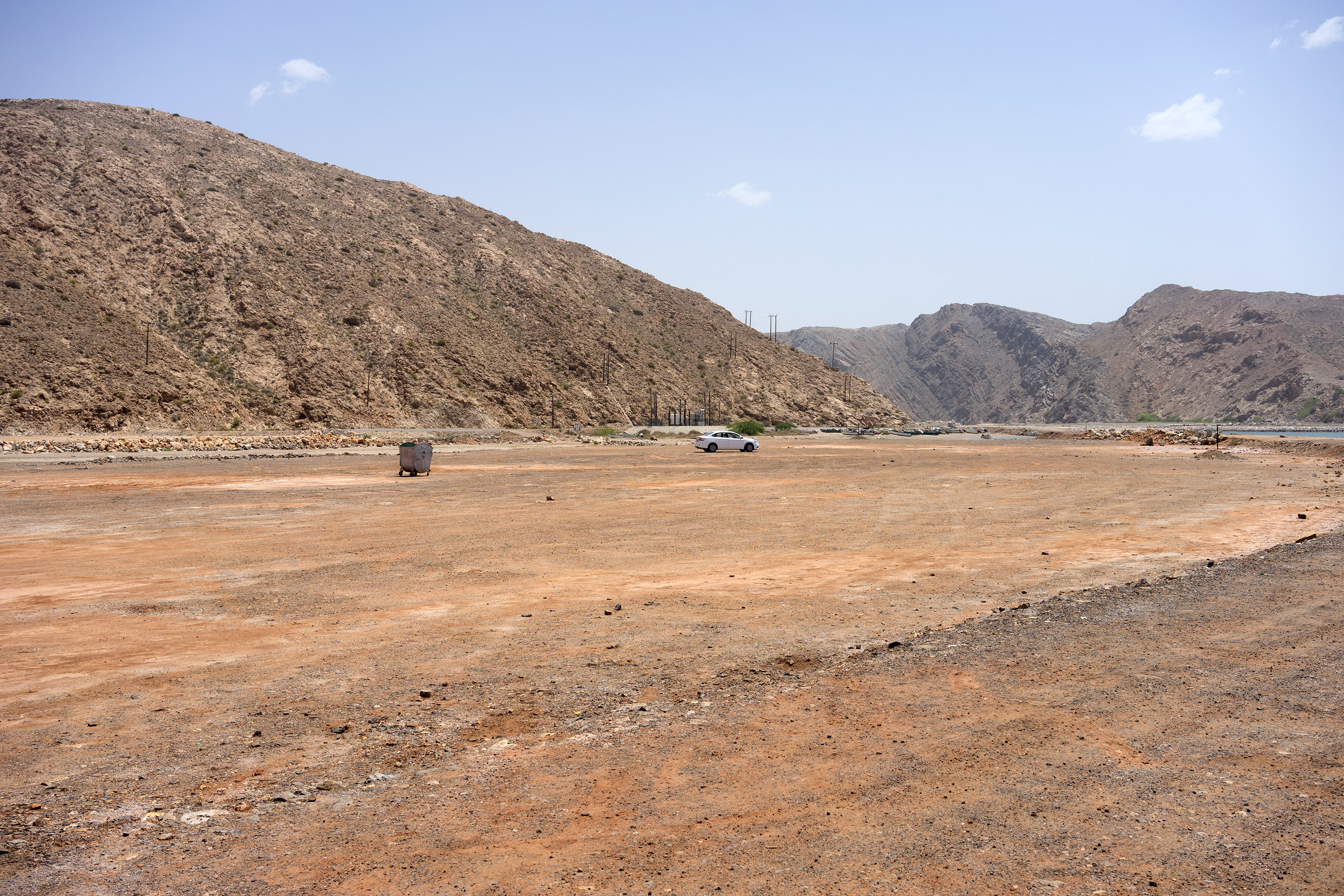 Tagesziel war die Stadt Sur rund 200 km südöstlich von Maskat. Sie war erheblich schwieriger zu finden, als ich bei der Planung angenommen hatte. Statt zwei war ich fast sieben Stunden unterwegs. Die Sonne stand im Zenit und bot keine Orientierungshilfe, und die schroffen Berge versperrten jegliche Sicht auf das Meer. Das Thermometer bewegte sich nur knapp unterhalb 50°C, als ich zwischen Yiti und As Sifah hin und her irrte. Als ich das Meer endlich erreicht hatte, führte mich die Straße bis in ein verlassenes Fischerdorf, an dessen Ende jedoch eine gewaltige Steilwand die Weiterfahrt versperrte.