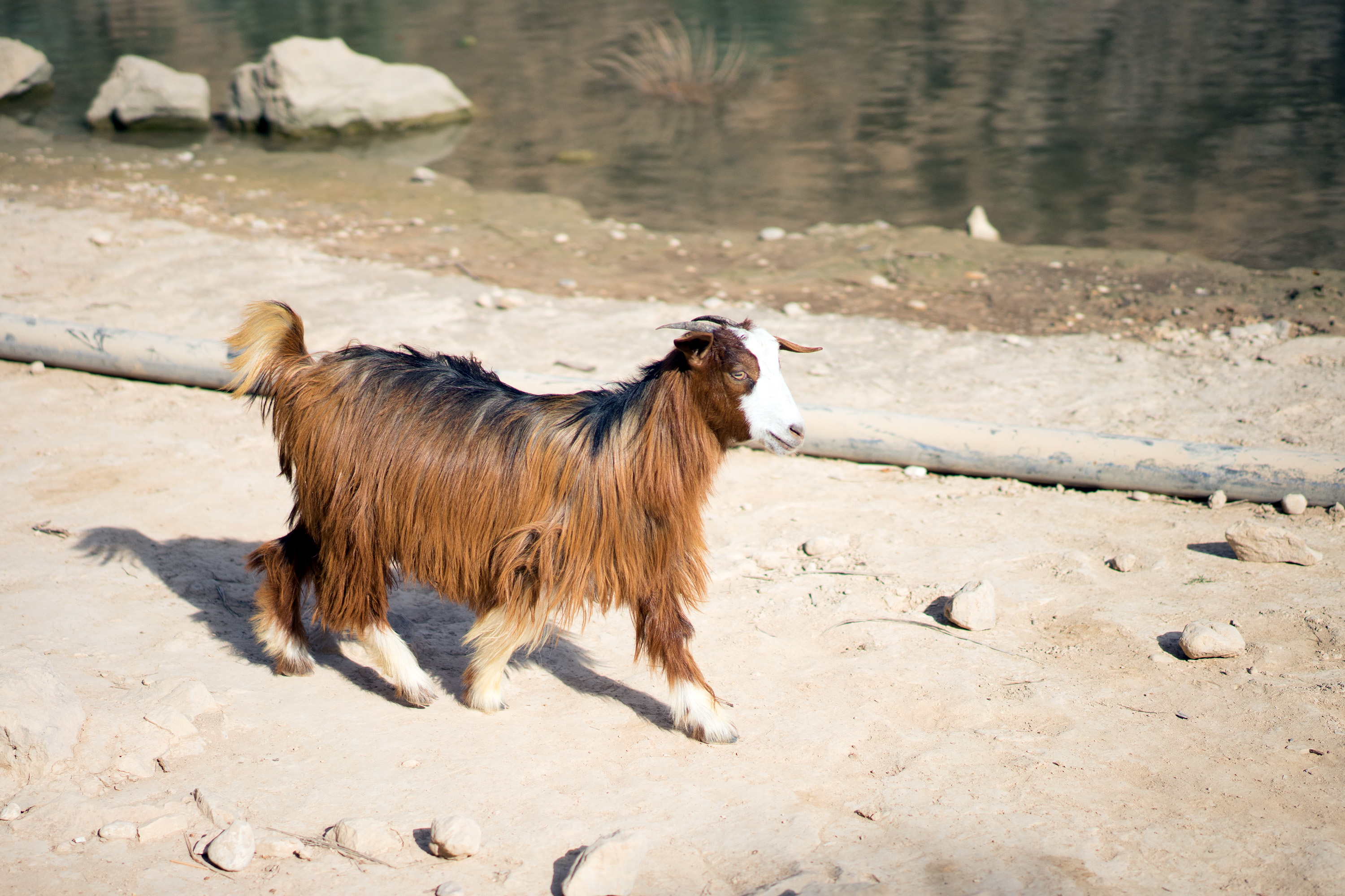 Kurz nach fünf Uhr morgens warf ich einen Blick auf das Thermometer, das 35°C anzeigte. Gegen halb acht Uhr brach ich zum Wadi Shab auf, einem Flussbett inmitten einer großen Schlucht rund 25 Kilometer nördlich von Sur. Es war noch nicht einmal acht Uhr, aber die Hitze war bereits schwer erträglich. Um den Weg am Wadi entlang hinaufwandern zu können, muss man zunächst den Fluss überqueren, aber es war noch kein Bootsmann zu sehen. Während ich wartete, leisteten mir einige scheue Ziegen Gesellschaft sowie ein wie aus dem Nichts aufgetauchter rotgebrannter Finne, der spontan ins Wadi wandern wollte, wegen der Hitze aber davon absah. Nach einer halben Stunde tauchte ein junger Omani auf, der mich ans andere Ufer brachte und sich derweil an seinem Deutsch versuchte. Dort brüllte mich ein Esel an. Eine Warnung?