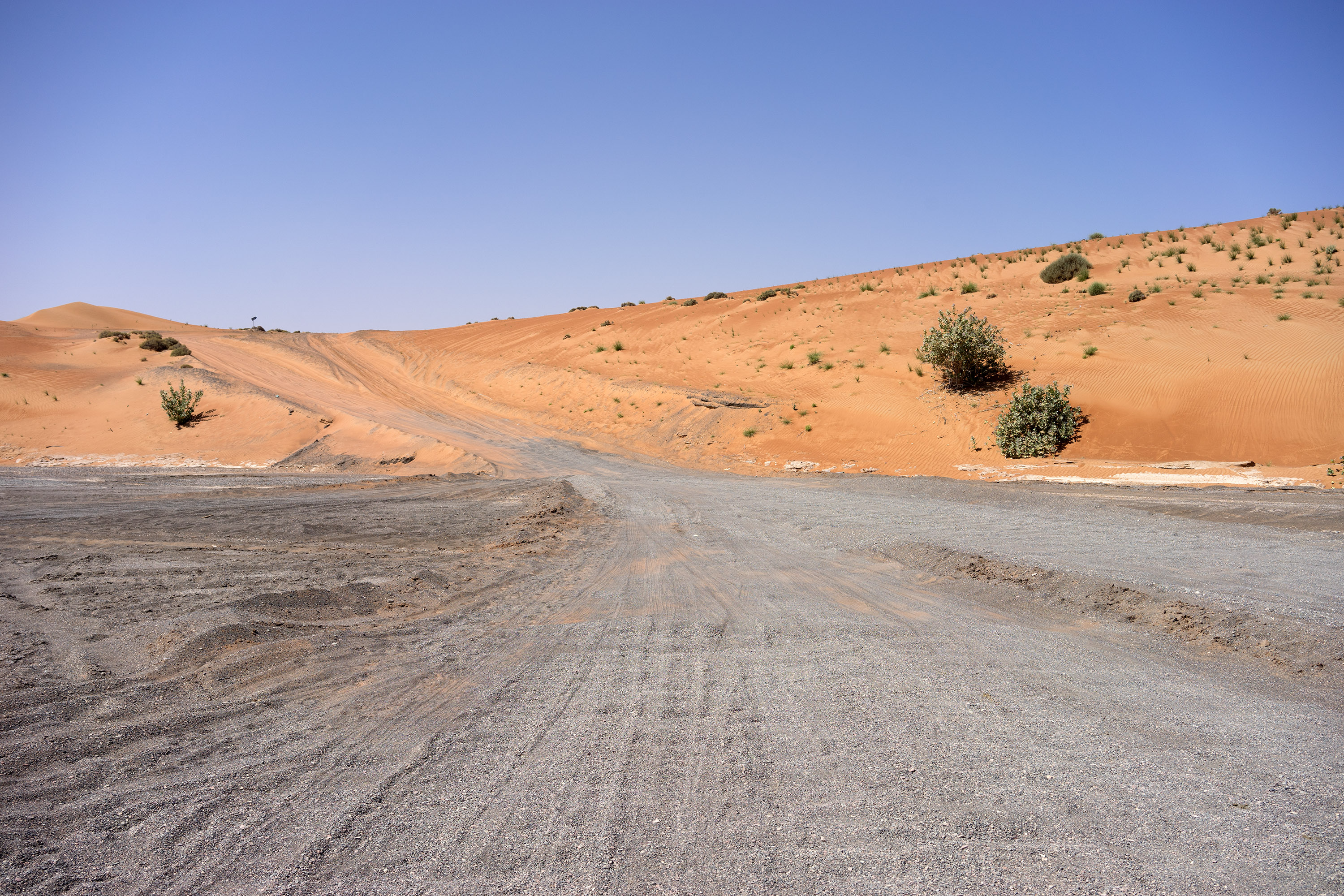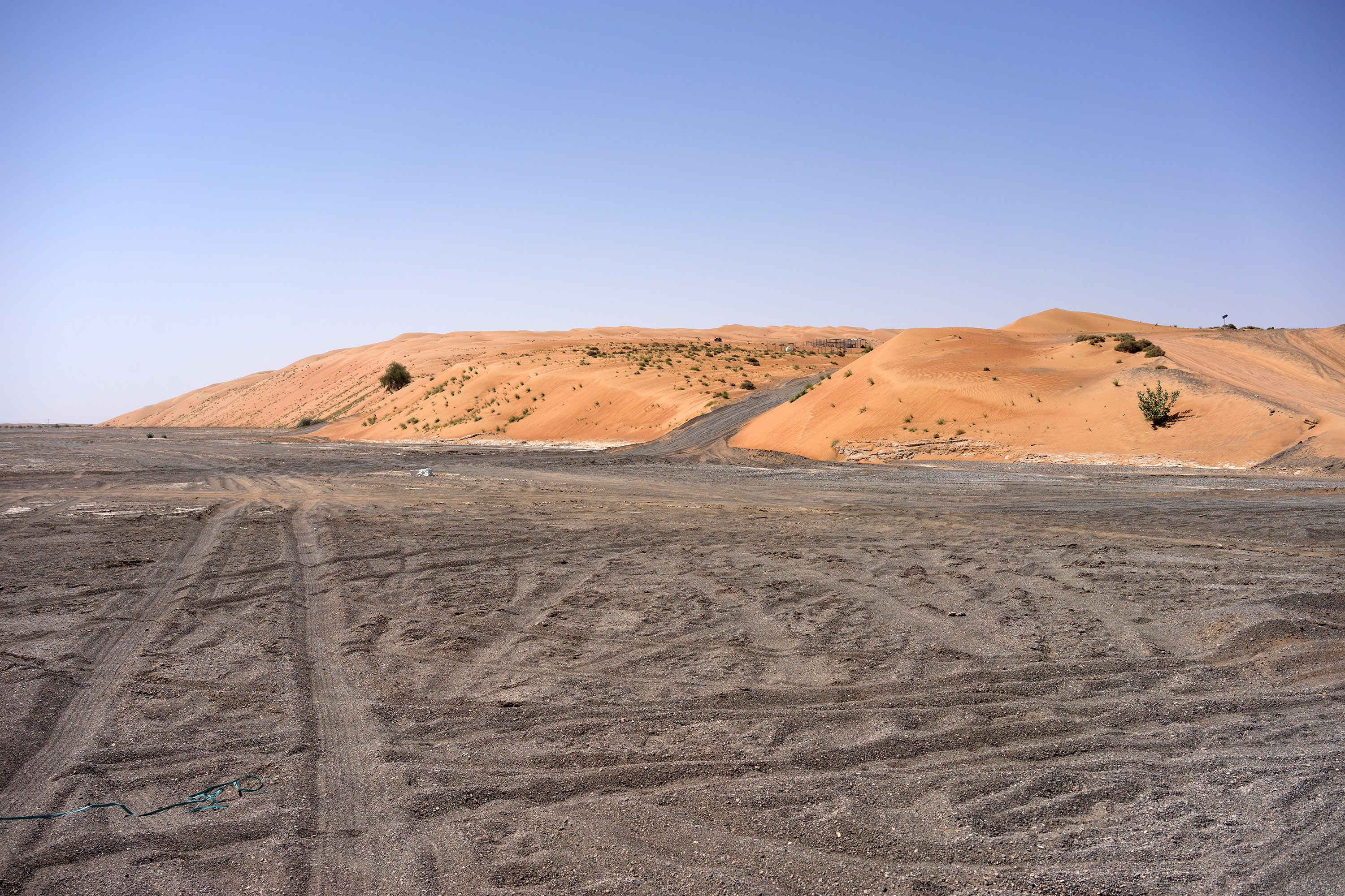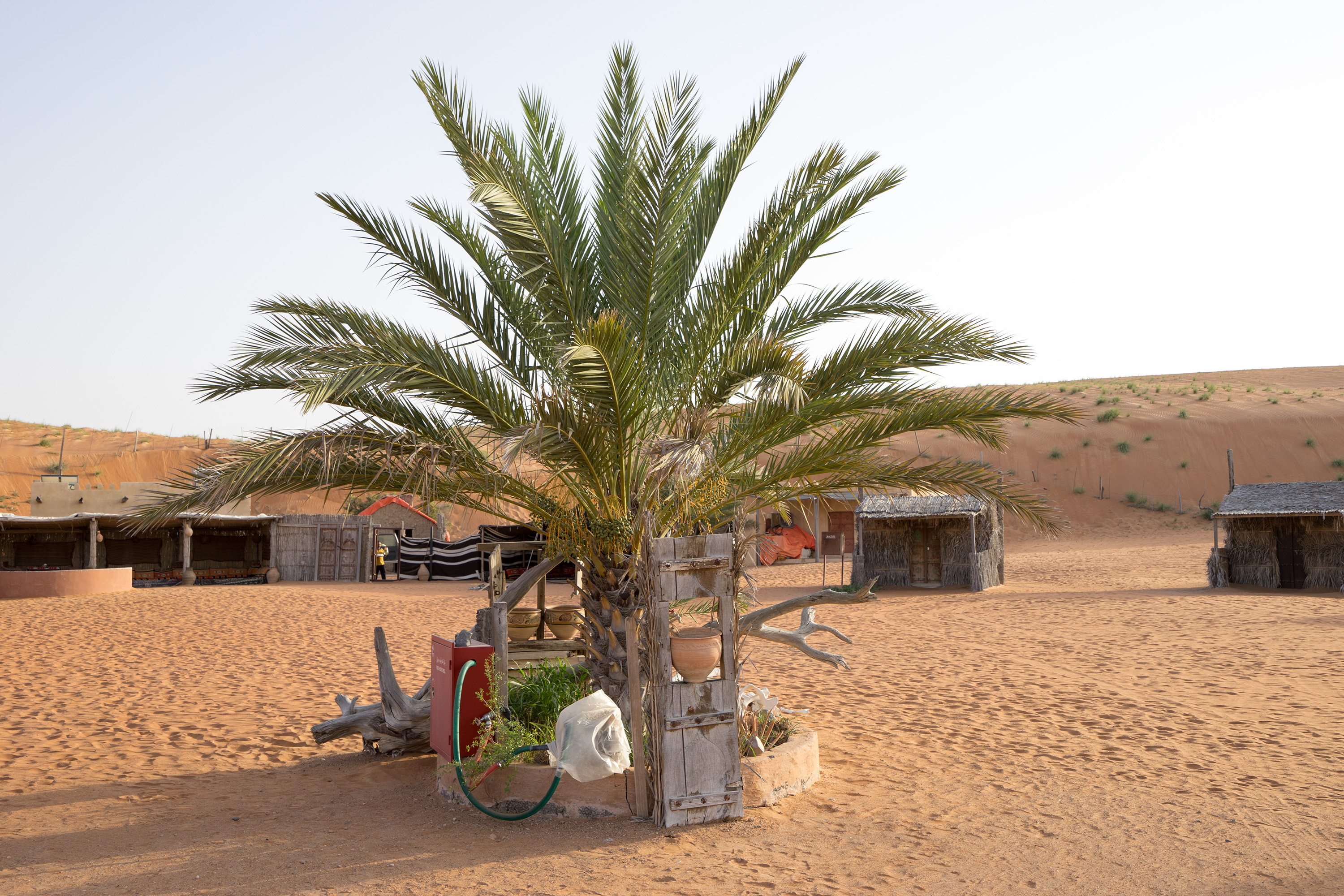 Gegen Mittag machte ich mich auf den Weg nach Al Wasil am Rande der Wüste, wo ich auf darauf wartete, ins „Nomadic Desert Camp“ abgeholt zu werden. Da ich deutlich zu früh eintraf, vertrieb ich mir die Zeit vor einem rustikalen Café mit Eistee und plauderte mit dem Inhaber und seinem Nachbarn, der ebenfalls aus Bangladesch stammte und eine kleine Werkstatt betrieb. Seine Haupttätigkeit bestand darin, Autoreifen aufzupumpen oder Luft herauszulassen, da sich prallgefüllte Reifen nicht für die Wüste eignen. Europa erschien ihm unerreichbar und wie eine geradezu unvorstellbar wohlhabende Fantasiewelt. In Bangladesch lebten zu viele Menschen mit unzureichenden Chancen, erklärte er mir.