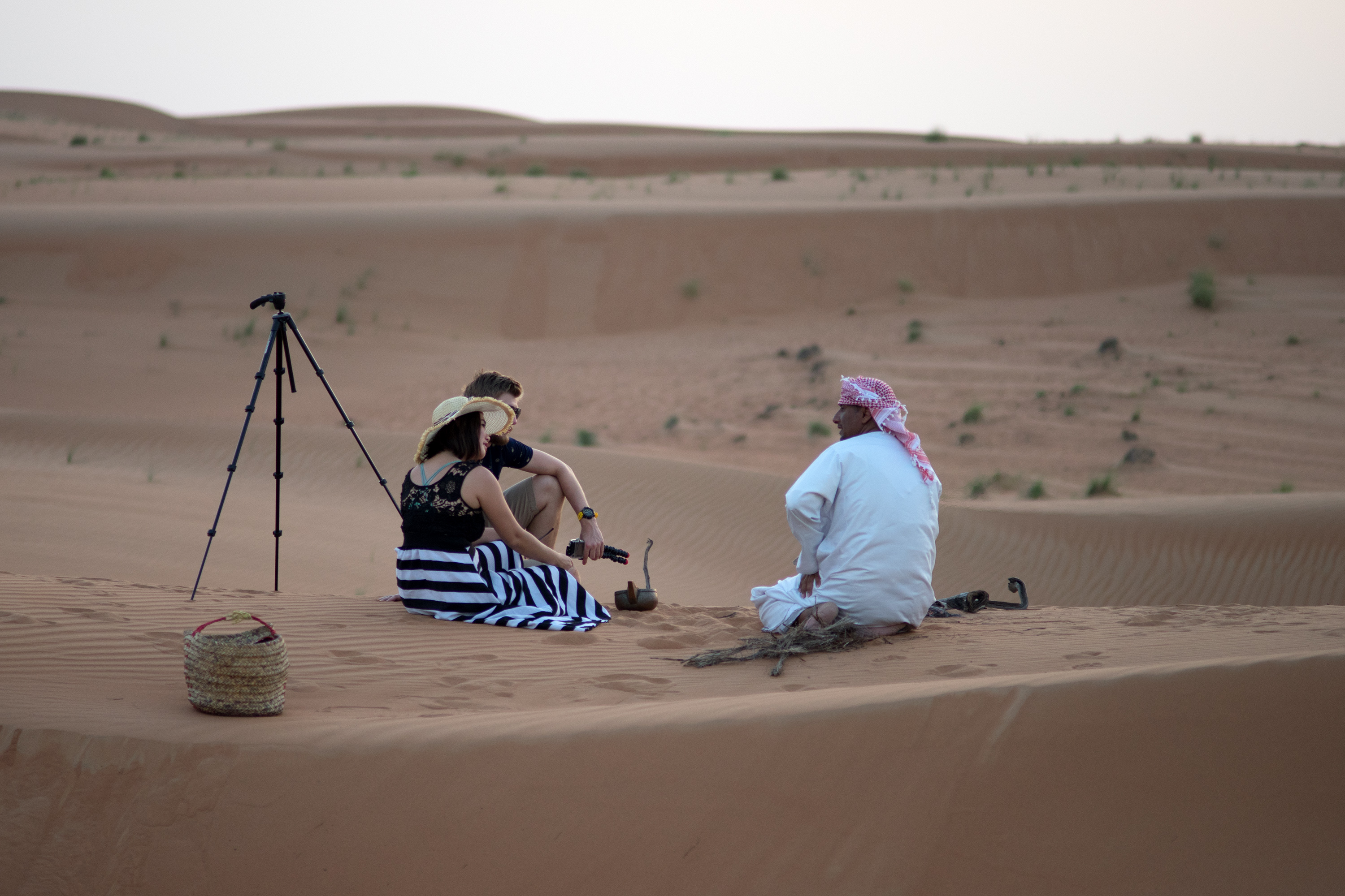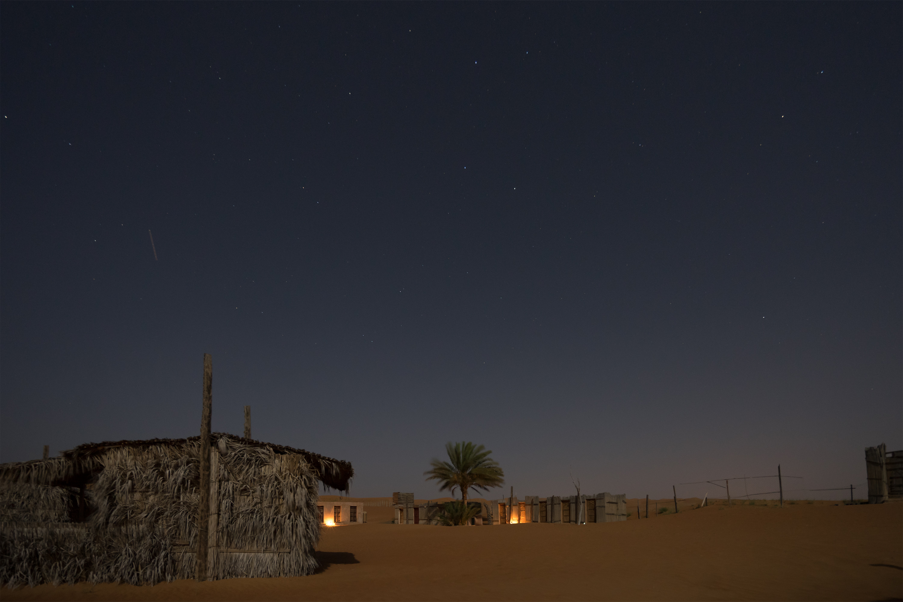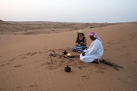 Jeder Gast bekommt seine eigene Hütte, allerdings mit den Betten davor gestellt, weil man bei Hitze draußen besser schläft. Rechtzeitig zum Sonnenuntergang fuhren wir vier aus dem Camp heraus auf eine Düne, wo Rashid uns Datteln und omanischen Kaffee mit Kardamom- und Nelkengeschmack reichte. Als die Sonne unterging, zog er sich für einige Minuten zurück zum Gebet. Dieser Abend mit Lagerfeuer in der Wüste, der gefühlten Unendlichkeit um uns herum und dem Vollmond über uns, der alles in Silber tauchte, gehört zu meinen schönsten Erinnerungen.