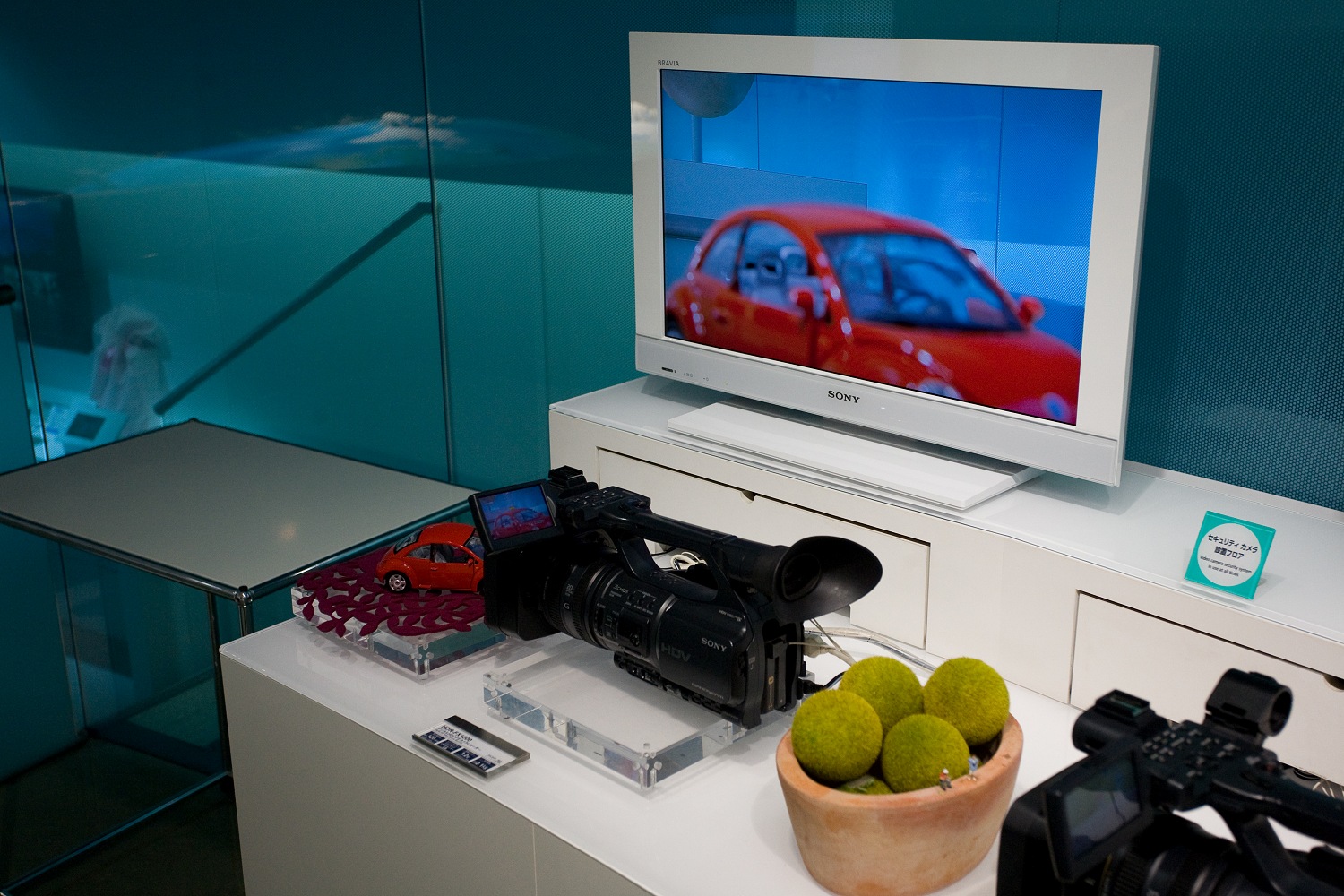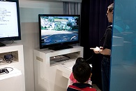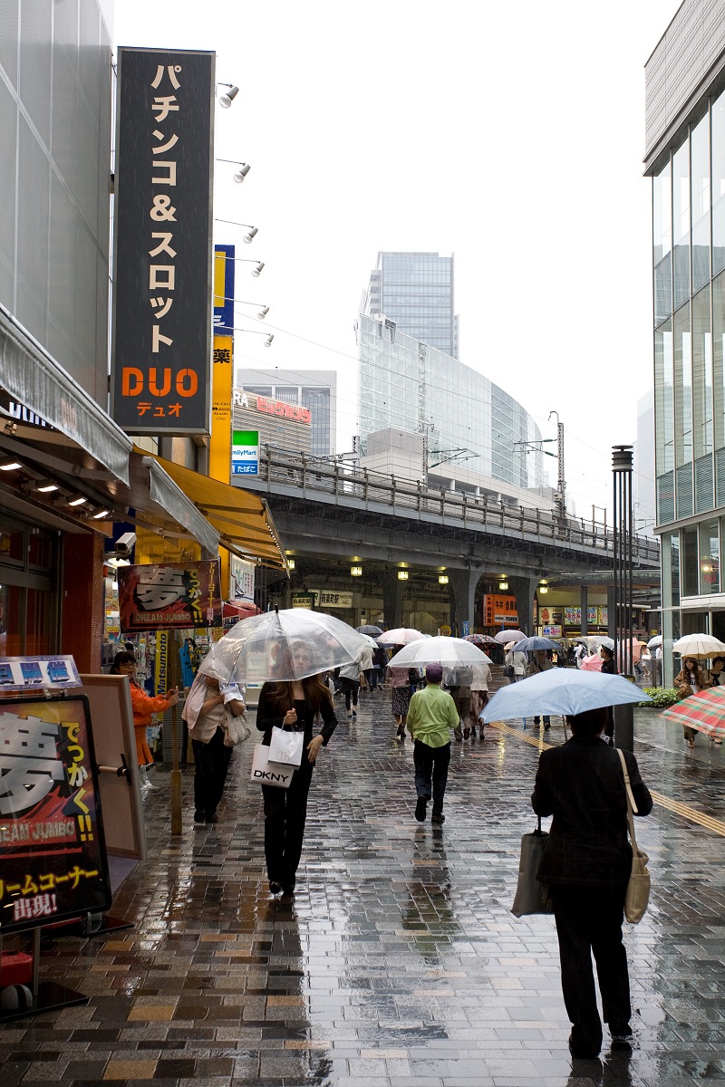 Ein Besuch des „Yakitori-Alleys“, wo es jede Menge Stände mit gebratenen Hühnchenspießchen gibt, fiel erst einmal aus. Da der Regen nur ein begrenztes Reiseprogramm zuließ, fuhren wir als erstes in den Stadtteil Ginza, der unmittelbar östlich an das Gelände des Kaiserpalastes anschließt. Dort warfen wir einen Blick ins Sony-Building, wo man jede Menge elektronischen Kleinkram befummeln kann. Hier spielen die Väter mit der Playstation und die Kinder gucken zu.