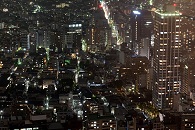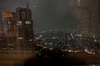 Im nicht enden wollenden Regen machten wir uns wieder nach Shinjuku auf, um einen Blick auf das nächtliche Tokio zu werfen. In einem benachbarten Hochhaus des Regierungsgebäudes, dem Sumitomo-Building, suchten wir im menschenleeren Erdgeschoss nach Fahrstühlen. Die, die wir fanden, waren allesamt mit roten Warnschildern versehen, die wir aber nicht entschlüsseln konnten. Innen waren sie an den Wänden mit Pappe verhängt und die Bedienungstasten für einige Stockwerke waren abgeklebt. Im obersten Stockwerk war auch niemand unterwegs, die Aussicht aber umso schöner.