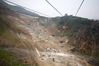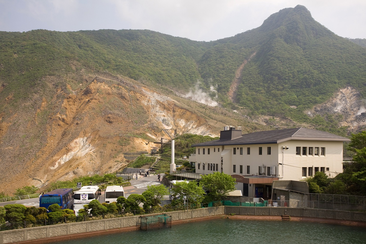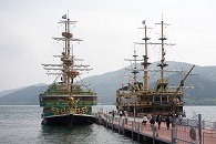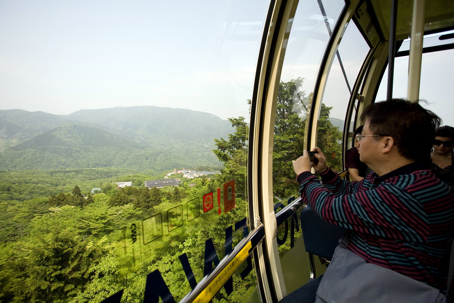 Mit einer Gondel ging es weiter den Berg hinauf und über ein Schwefelbergwerk, über dem es nach faulen Eiern stank. In unserer Kabine saß eine junge französische Frau, die die Aufschrift „Nicht aus dem Fenster lehnen“ laut vorlas und dann ihren Freund fragte: „C'est allemand?“ — „Non, c'est suisse“, mischte sich ihr Nachbar ein. An der nächsten Station mussten wir noch einmal in eine andere Gondel umsteigen, die uns den Berg auf der anderen Seite wieder herab und an den Ashi-See brachte. Unsere Befürchtungen bewahrheiteten sich, denn vom Fuji war im diesigen Nebelschleier weit und breit nichts zu sehen.