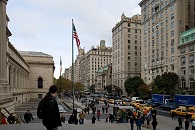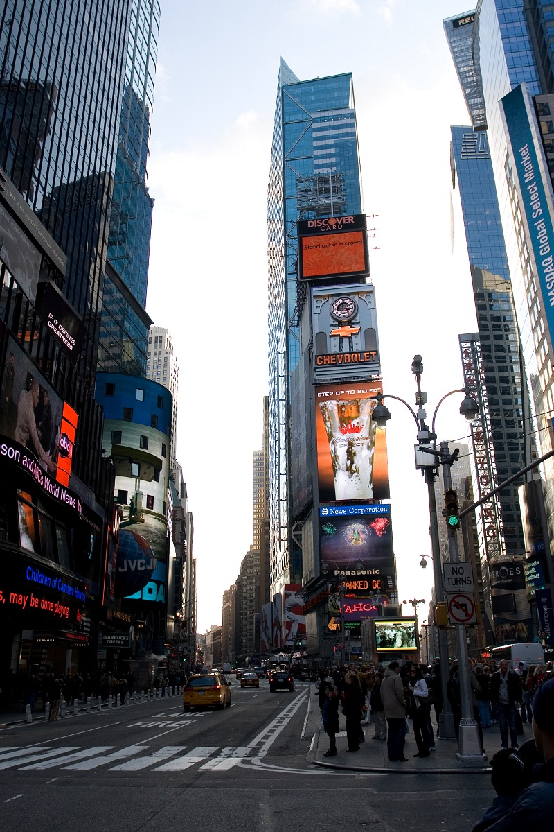 Wir gingen weiter nach Norden und vorbei am Rockefeller Center. Die Arbeiter, die gerade den großen Weihnachtsbaum errichteten — den größten der USA — waren so ziemlich die einzigen Menschen, die wir um diese Uhrzeit sahen. Sagt man nicht, New York sei die Stadt, die niemals schläft? Am Lower Plaza wurde außerdem die Eislaufbahn vorbereitet, die man aus vielen Filmen kennt. Da es an diesem Morgen zwar sehr frisch, aber noch nicht eisig kalt war, wollte sich bei uns noch keine Weihnachtsstimmung einstellen. Neben dem Rockefeller Center befindet sich die St. Patrick's Cathedral, die wir aber erst später besuchen wollten. Wir fuhren zur 86. Straße und suchten eine Möglichkeit zum Frühstücken. Leider hatten die meisten Geschäfte noch geschlossen und wir landeten nach einigem hin und her bei Starbucks und aßen zum ersten Mal Bagels. Ich lernte dabei Englisch auf die harte Tour, da ich, frierend und dennoch mutig, versehentlich einen Eiskaffee bestellte. Wer hätte an meiner Stelle, da ich so gut wie nie zu Starbucks gehe, denn auch ahnen können, was sich hinter „Frappuccino“ verbirgt? Während wir bei Starbucks saßen, wunderten wir uns über die vielen New Yorker, die bei diesen frostigen Temperaturen mit T-Shirts, kurzen Hosen und Badeschlappen unterwegs waren. Einige waren bis zur Hüfte sogar richtig gut gekleidet und trugen Mantel und Jacket, abwärts der Hüfte jedoch wiederum kurze Hose und Badeschlappen. Vielleicht reichte das Geld nur bis zum Gürtel. J. fühlte sich bei diesem Anblick jedenfalls an seinen Kiez in Berlin-Neukölln erinnert.