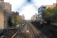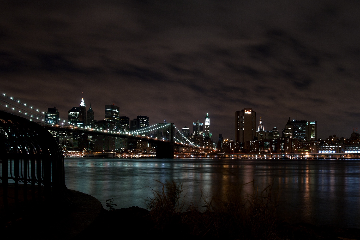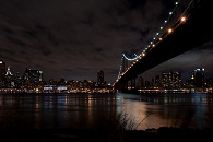 Bei dichtem Gedränge in der U-Bahn fuhren wir anschließend unter der Brooklyn Bridge hindurch ans andere Ufer des East Rivers. Die Leute fahren augenscheinlich morgens zur Arbeit nach Manhattan und abends zurück nach Brooklyn oder Queens. Am anderen Ufer war wenig los und die alten Industriegebäude, Kopfsteinpflaster, das man in New York nur noch selten sieht, und der Blick auf die Manhattan Bridge erinnern an Szenen aus „Es war einmal in Amerika“. Wir gingen unter der Manhattan Bridge hindurch zur Brooklyn Bridge, wo sich der Brooklyn-Bridge-Park befindet, von dem man eine grandiose Sicht auf Downtown Manhattan hat; die World Trade Center fehlen allerdings als markante Spitze. Da ich kein Stativ besitze und mich nicht traute, den zufällig neben mir stehenden Fotografen zu fragen, ob er mir seins leiht, musste ich meine Kamera notdürftig auf einem Felsblock abstellen, um genügend Belichtungszeit zu bekommen.