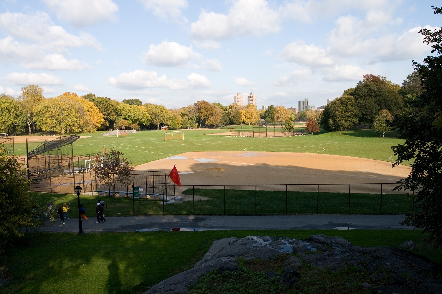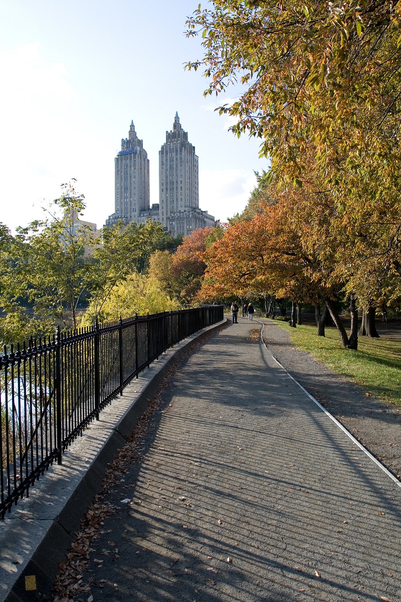 Vorerst gestärkt gingen wir in Richtung Central Park. Der Himmel war nun aufgerissen und die Sonne angenehm warm. Wir durchwanderten den Park in nördlicher Höhe und freuten uns über die vielen Eichhörnchen, die alle paar Meter herumstanden oder Nüsse vergruben. Ein Japaner — es kann eigentlich nur ein Japaner gewesen sein! — zog eine Mülltonne hinter sich her auf die Wiese, um sie vor einen jener herbstlich gefärbten Bäume zu stellen und zu dort fotografieren.
