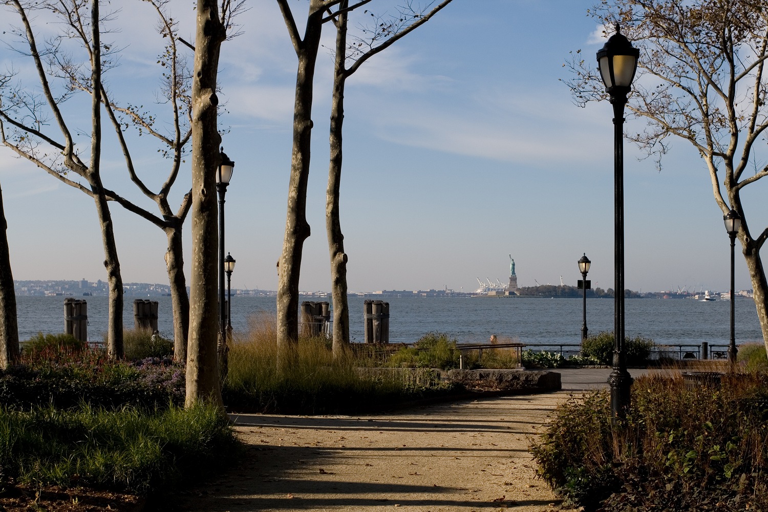 Das herrliche Wetter wollten wir nutzen und eine Fahrt mit der Fähre Richtung Ellis Island wagen, um die Freiheitsstatue zu sehen. Als wir mit der U-Bahn die Station der Staten-Island-Fähre erreichten, mussten wir noch ein paar hundert Meter hinter uns bringen, um zur Fähre zu gelangen. Unterwegs konnten wir vom Ufer aus die Freiheitsstatue und Ellis Island erblicken. An der Anlegestelle stellten wir dann aber fest, dass wir pro Person zwölf Dollar zahlen müssten. Das war uns zu doof. Wir gingen also zurück, um mit der Staten-Island-Fähre zu fahren, die keinen Cent kostet.