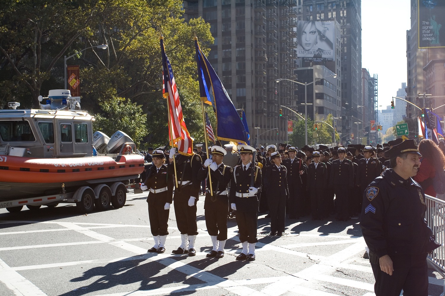 Zu Füßen des Flatiron Buildings gerieten wir in eine Militärparade, denn es war Veteran's Day. Wir beobachteten das bunte Treiben für eine Weile und gingen dann bei McDonald's etwas essen. S. waren die in der Tat schäbigen Hamburger zu eklig, weshalb sie sich kurze Zeit später in einem Deli mit leckerem Essen versorgte. Hätten J. und ich es doch nur ebenso getan. Als sie an der Kasse nicht wusste, wie viel sie bezahlen sollte und wie, half ihr ein Kunde hinter ihr: „You take one of these ... put your food in ... then you give it to the cashier and pay an incredible amount of money.“ Jener lässige Kerl war für S., wie sie später sagte, der New Yorker schlechthin. Beim Weitergehen rempelte ich versehentlich einen Mann an und fing mir spottendes Gelächter von S. und J. ein, als ich reflexartig um deutsche „Entschuldigung!“ bat.