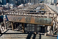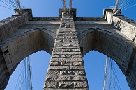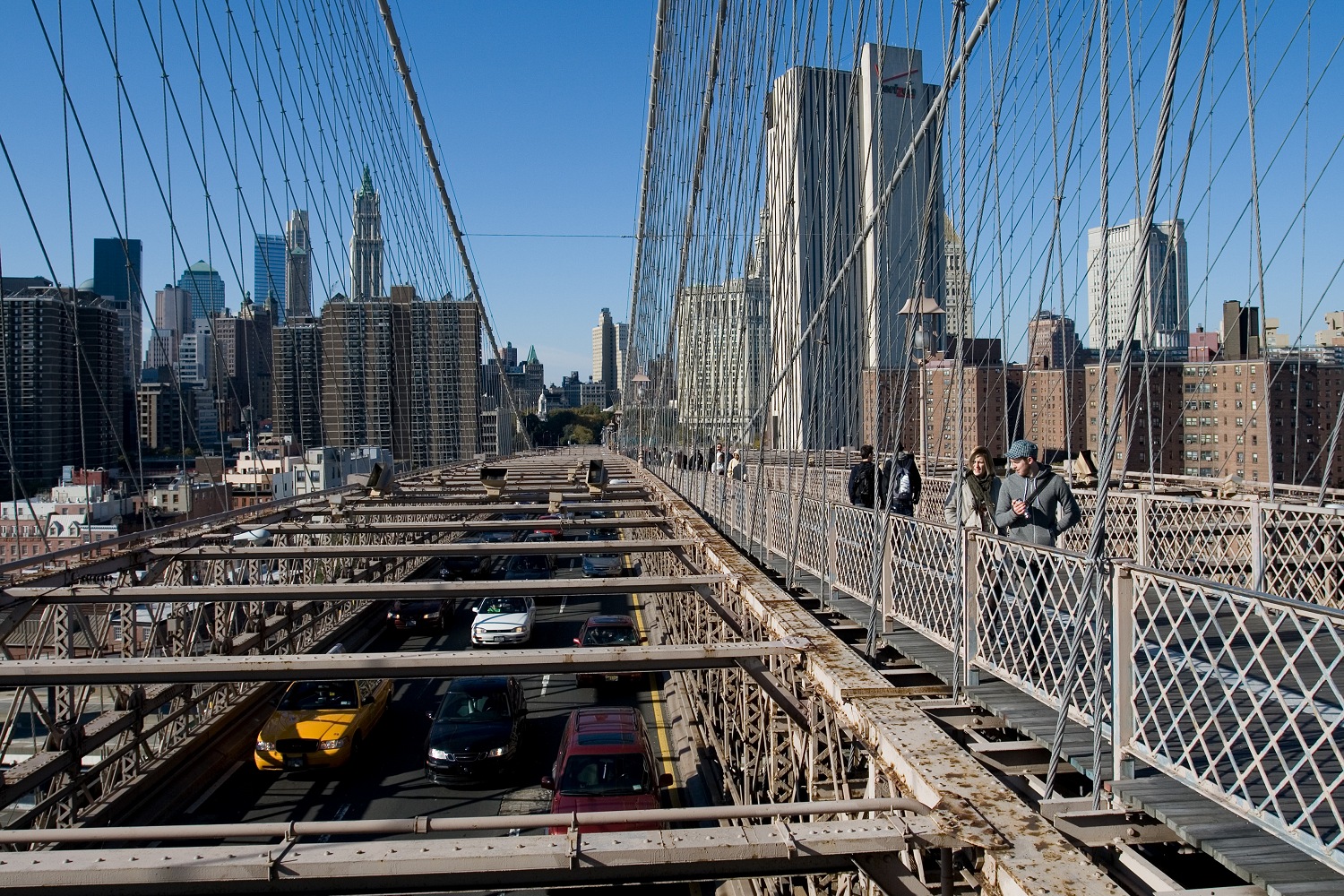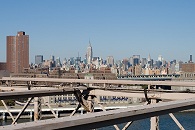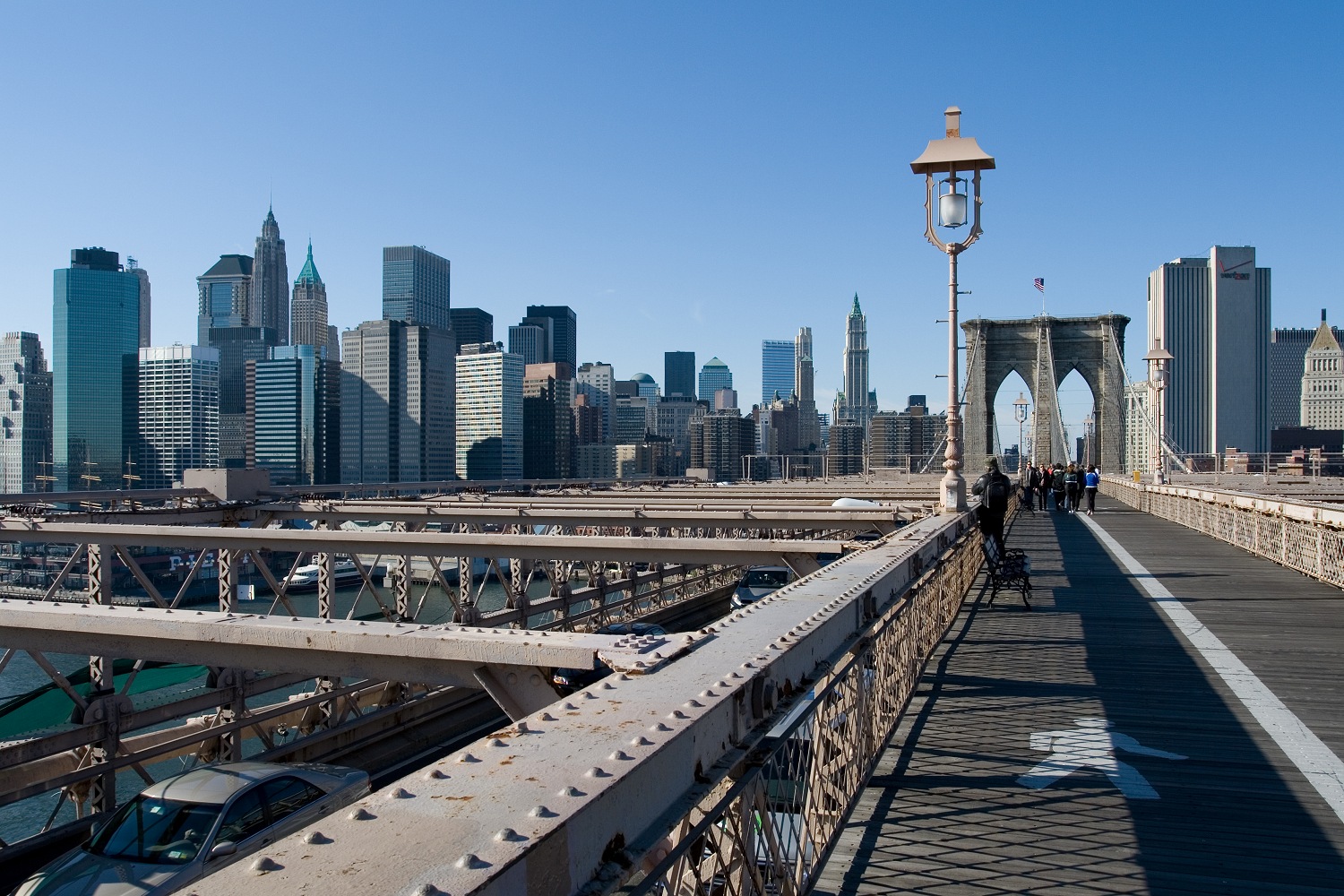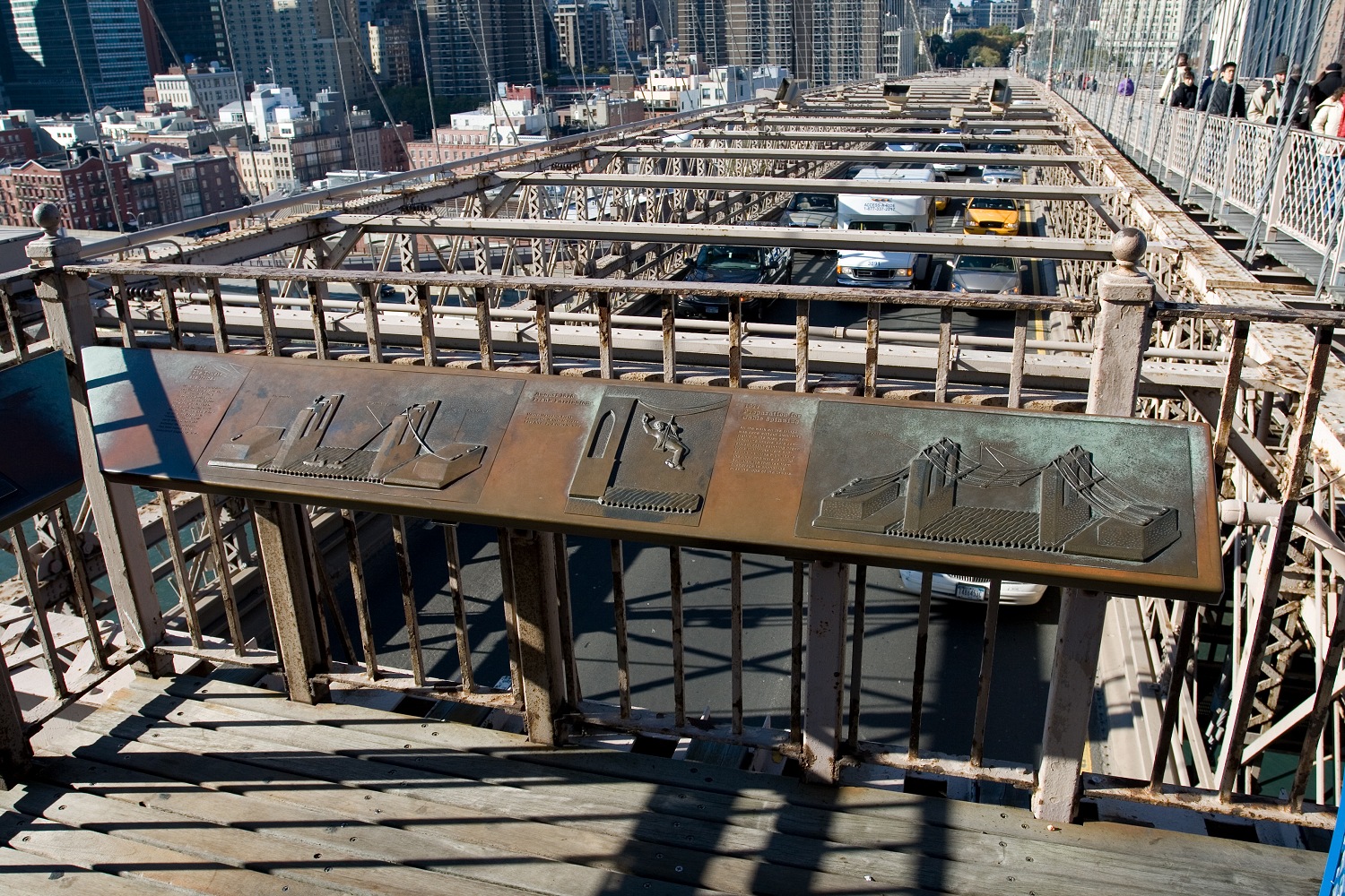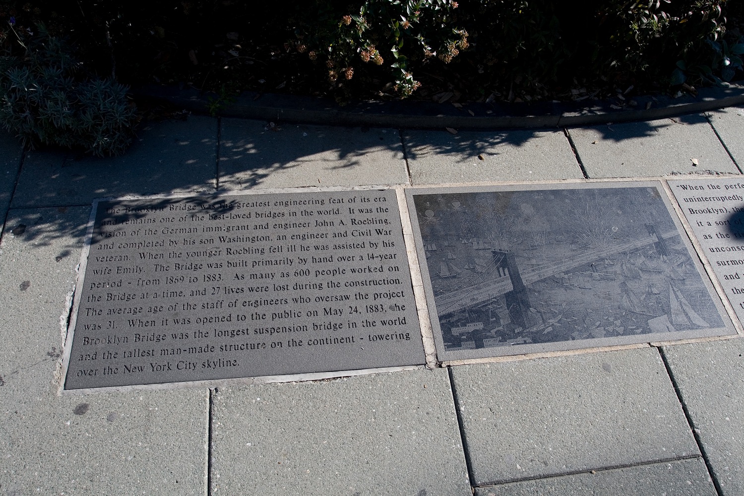 Auf der Brooklyn Bridge war Hochbetrieb. Ich kaufte mir bei einem Verkäufer auf der Brücke eine Flasche Poland Spring für unterwegs und beging nach wenigen hundert Metern den Fehler, nach unten zu blicken. Unter den mir viel zu dünn erscheinenden Holzbalken ging es rund 40 Meter in die Tiefe. Von da an zitterte ich jedes Mal, wenn ich nach einem meiner vielen Fotos die Abdeckklappe wieder auf das Objektiv setzen wollte. Wäre sie mir heruntergefallen und zwischen einer der Ritzen verschwunden, hätte ich sie niemals wiedergesehen. Die Brücke ist 1834 Meter lang und wurde von dem Deutschstämmigen John August Roebling konzipiert, der im thüringerischen Mühlhausen geboren wurde. Bei Vermessungsarbeiten quetschte er sich seinen Fuß und büßte die verletzten Zehen ein. Da er medizinische Behandlung ablehnte und seine eigene Heiltherapie darin bestand, ständig Wasser über die Wunde zu gießen, starb er kurze Zeit später an einer Tetanusinfektion.