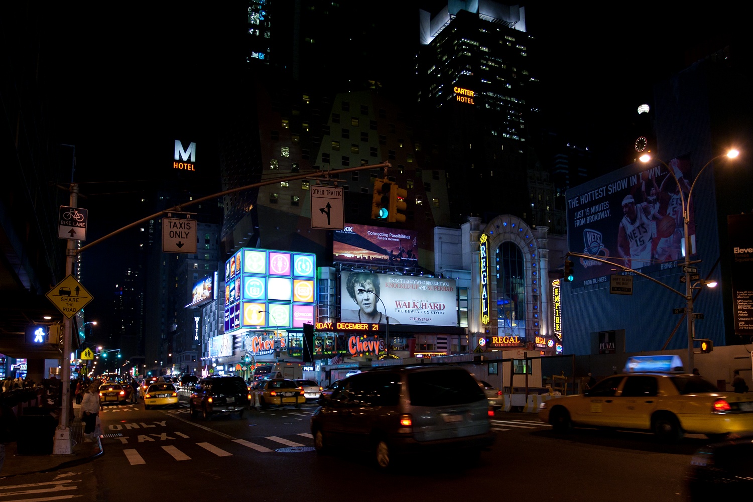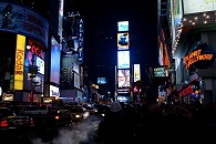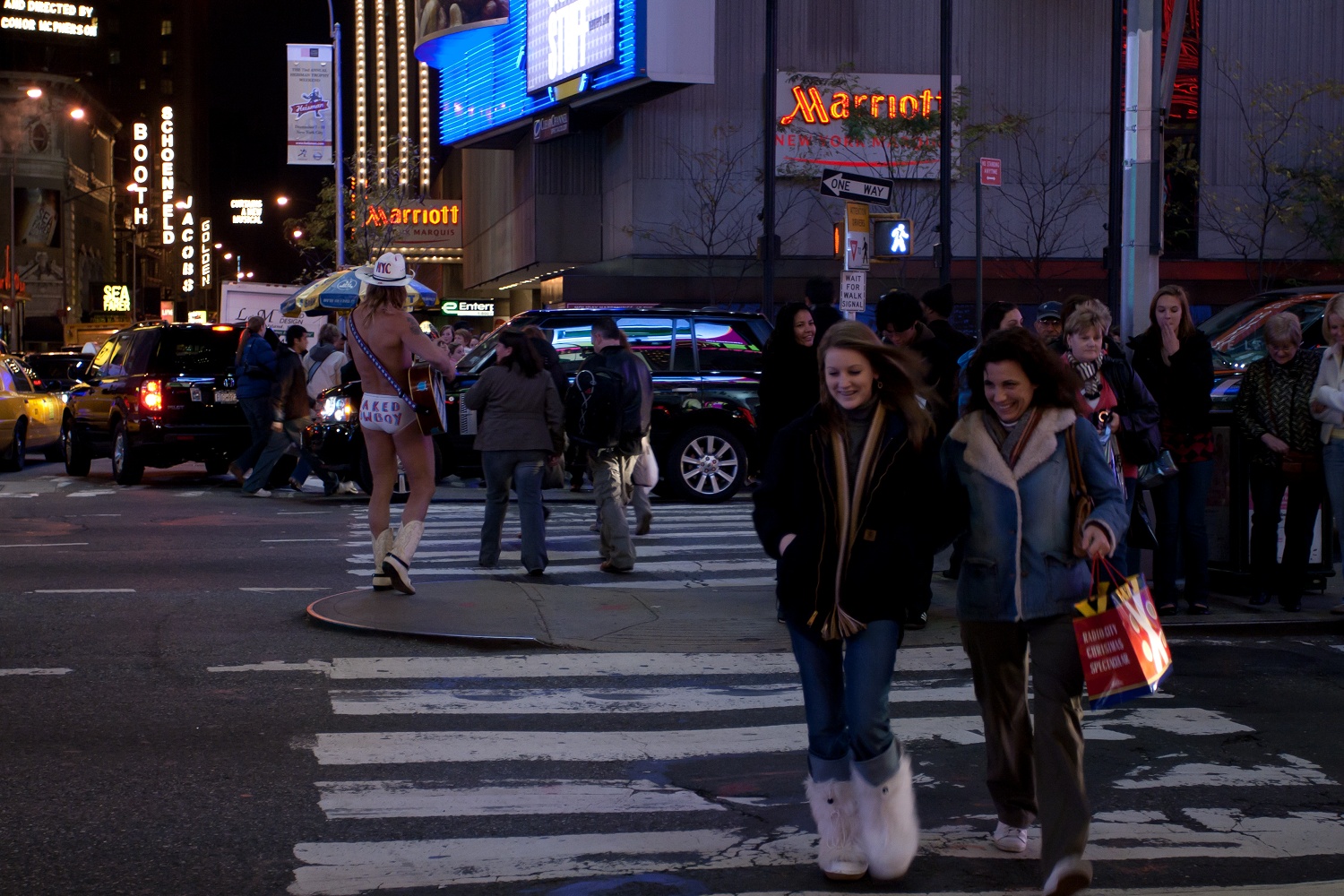 Als es zu unserer Herberge gehen sollte und wir wie üblich den Times Square überquerten, wurden wir überrascht, denn er war an jenem Abend da. Schon aus der Ferne sah man ihn auf der Verkehrsinsel stehen und konnte ihn singen hören, „hey-ho, I'm the Naked Cooowboy!“ S. und ich sahen ihn uns aus der Nähe an. J. war das zu doof, er wartete lieber am Straßenrand auf uns. Später freute er sich dafür umso mehr, als er dieses Video sah, das S. mit ihrer Kamera aufnehmen konnte. Cowboy-Overkill! Der Naked Cowboy, der aussieht wie Miles O'Keeffe, lockte spielend Passanten an — etwa ein leicht bekleidetes Mädchen mit den Worten „Baby, you're not wearing any clothes!?“ —, ließ sich mit ihnen ablichten und verlangte pro Foto zwei Dollar. Im Nachhinein bereue ich es, ihm kein Geld in seine Stiefel gesteckt zu haben. Wir drei und der Naked Cowboy, hätte ich mir das an die Wand hängen können? Dass er bei jener Temperatur diese Vorstellung bot, bewies Größe und Humor. Im Vordergrund also der Naked Cowboy und ein vorübereilender Rabbiner, im Hintergrund der bunte Times Square und viele Taxis. Das ist New York! Leider sollten wir den Cowboy in den nächsten Tagen nicht wiedersehen — vermutlich hatte er sich erkältet.