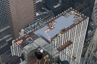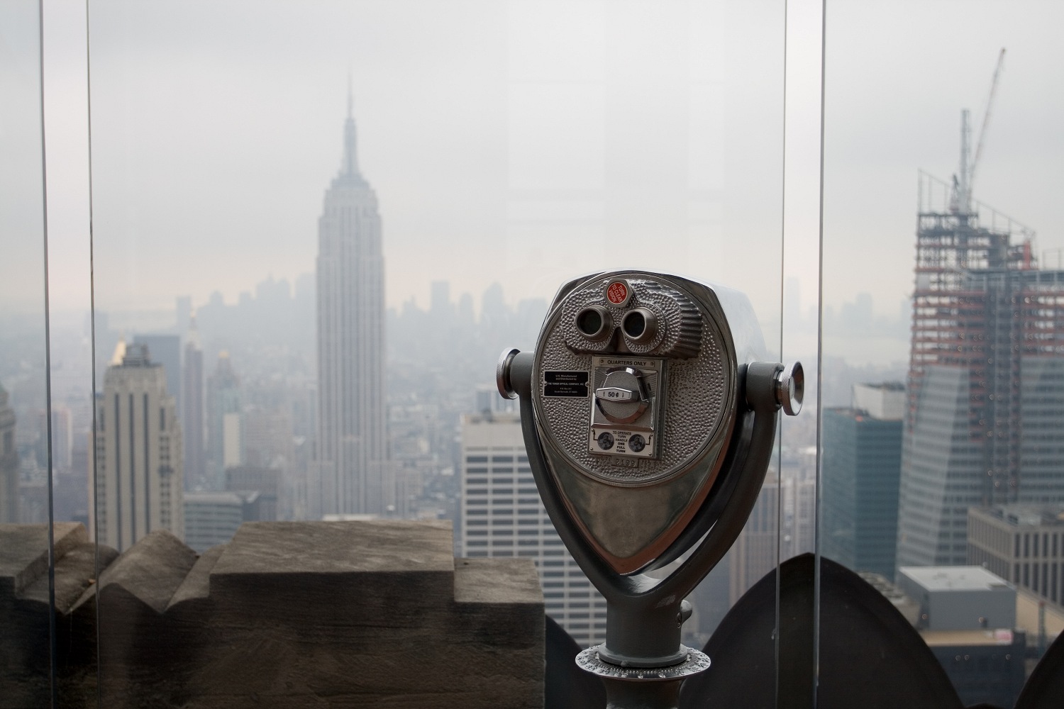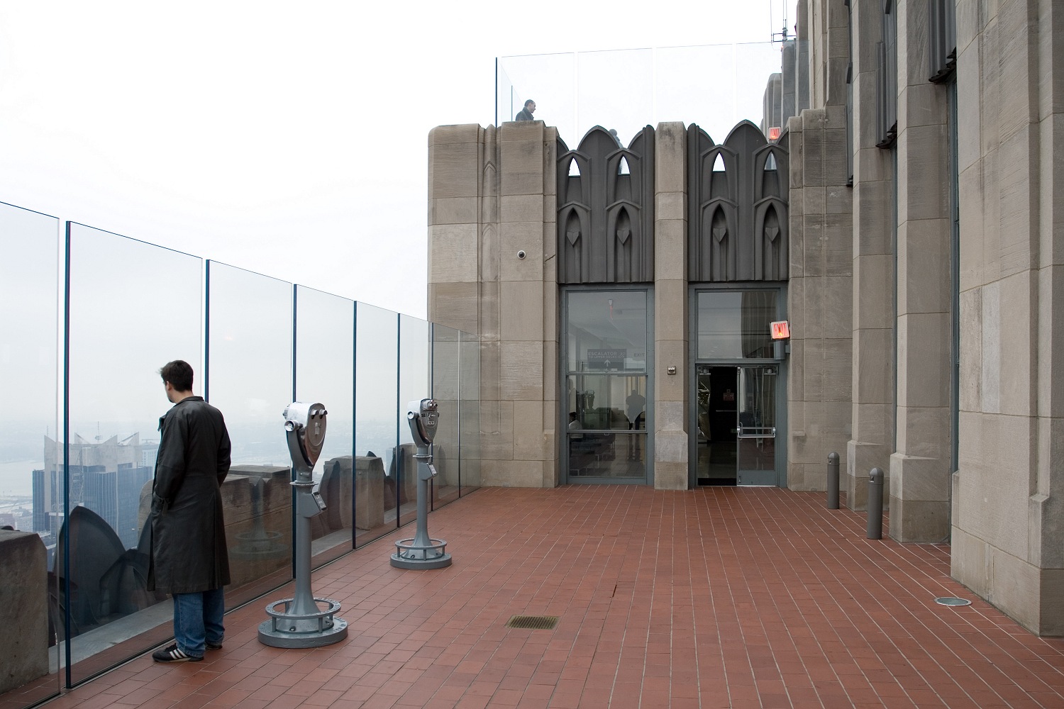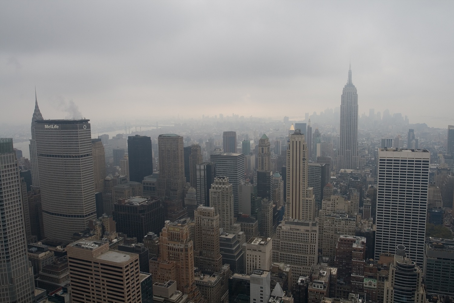 Nach einem kurzen Film über die Entstehungsgeschichte des Komplexes fuhren wir mit dem Fahrstuhl nach oben. Er hatte eine gläserne Decke und erlaubte uns einen spektakulären Blick ins Innere des Fahrstuhlschachtes. Die Fahrt kam mir langsamer vor als sie tatsächlich war. Der Horizont war leider etwas nebelverhangen, aber für einen Eindruck über New York bei Tag reichte es. In unserer Herberge hatte man uns das Rockefeller Building im Gegensatz zum Empire sehr ans Herz gelegt, und tatsächlich, die Sicht von hier oben war grandios. Man kann den Central Park überblicken, was vom Empire aus nur schwer möglich ist. Dazu ist das Observation Deck doppelstöckig und bietet mehr Besuchern Platz als die vergleichsweise schmale Plattform des Empires.