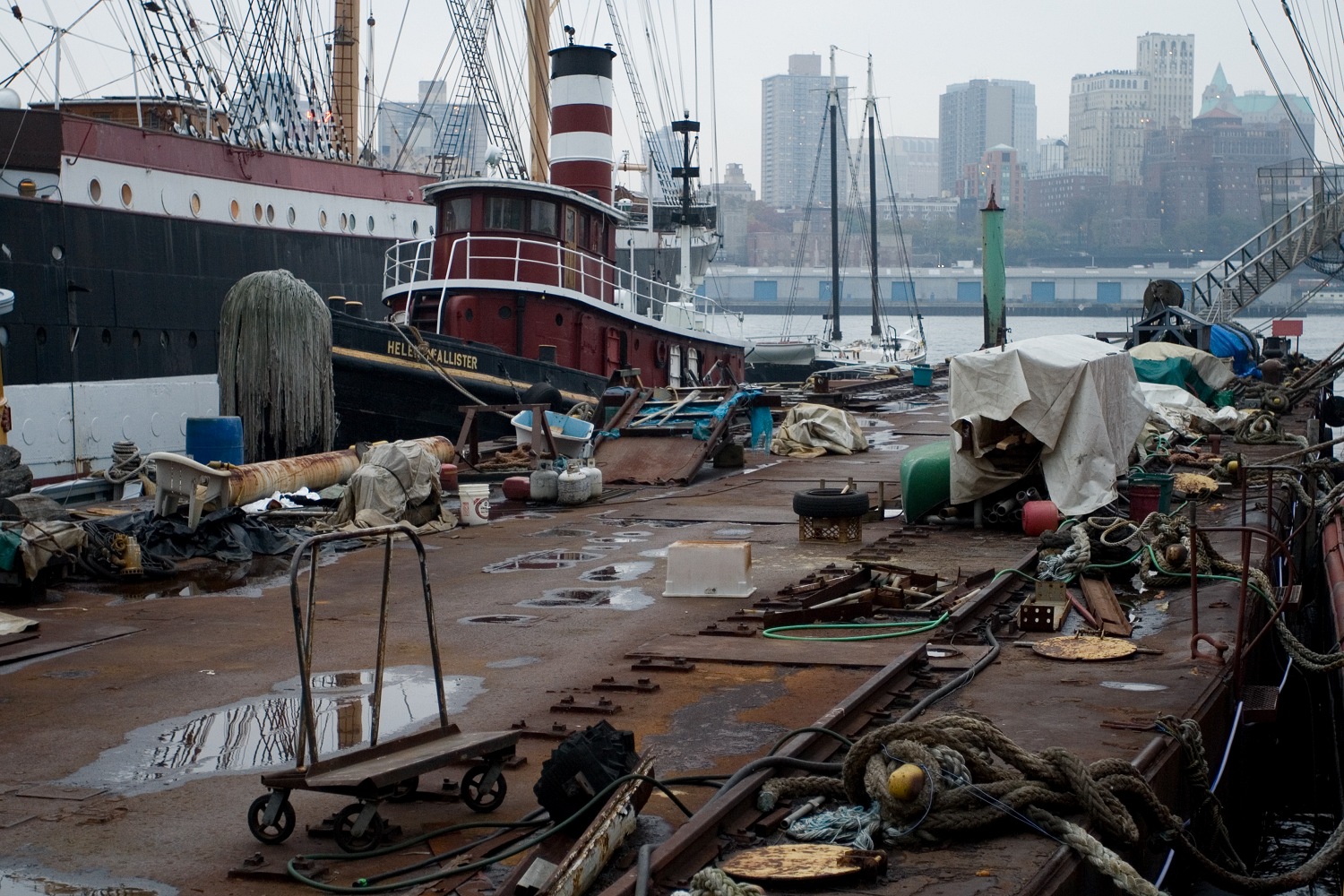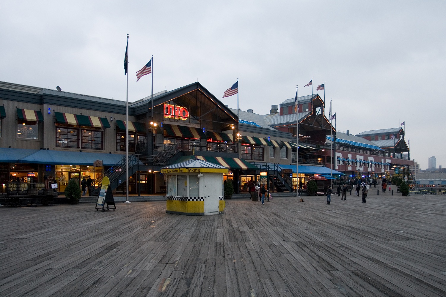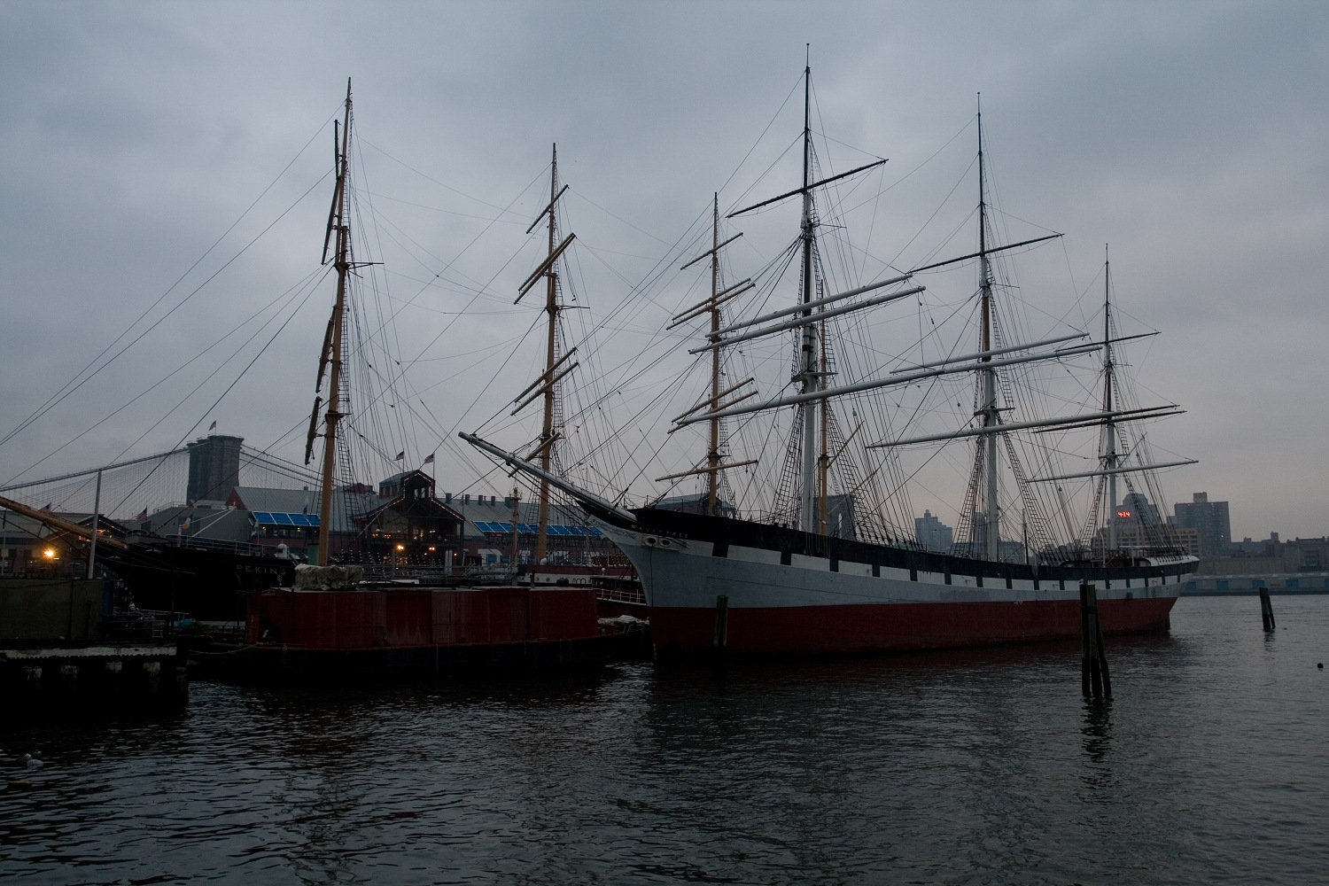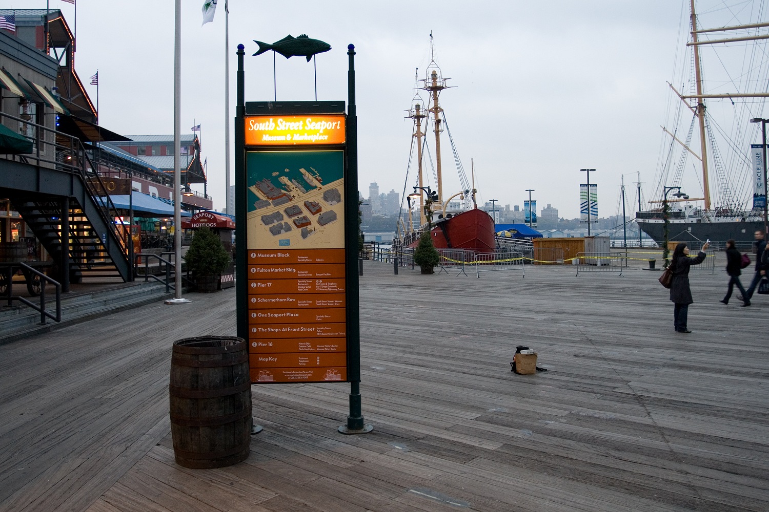 Danach ging es zurück in die Herberge, um auf S. zu warten. Sie war etwas verspätet, weil ihre MetroCard an den Eingangsschranken der U-Bahn plötzlich nicht mehr funktionierte. Wir fuhren gemeinsam zum historischen Hafen, wo es weniger zu sehen gab, als wir uns versprochen hatten. Nach wenigen Minuten latschten wir daher zurück Richtung Wall Street, um irgendwo etwas zu essen. Wir kamen an einer Subway-Filiale vorbei, die zweimal einen Fuß Sandwich für 7,99 Dollar anbot, also etwa zweimal 30 Zentimeter. Da das Angebot erst ab 17 Uhr galt und wir bis dahin noch eine halbe Stunde Zeit hatten, gingen wir nebenan einen Kaffee trinken. Das Lokal wirkte wie aus einem schrägen Roadmovie, die Mitarbeiter darin machten einen traurigen Eindruck und die Stimmung war melancholisch-gedrückt. Als ich J. darüber aufklärte, dass nachgeschenkter Kaffee kostenlos ist, konnte er sich kaum noch im Zaum halten, die Kellnerin herbeizurufen.