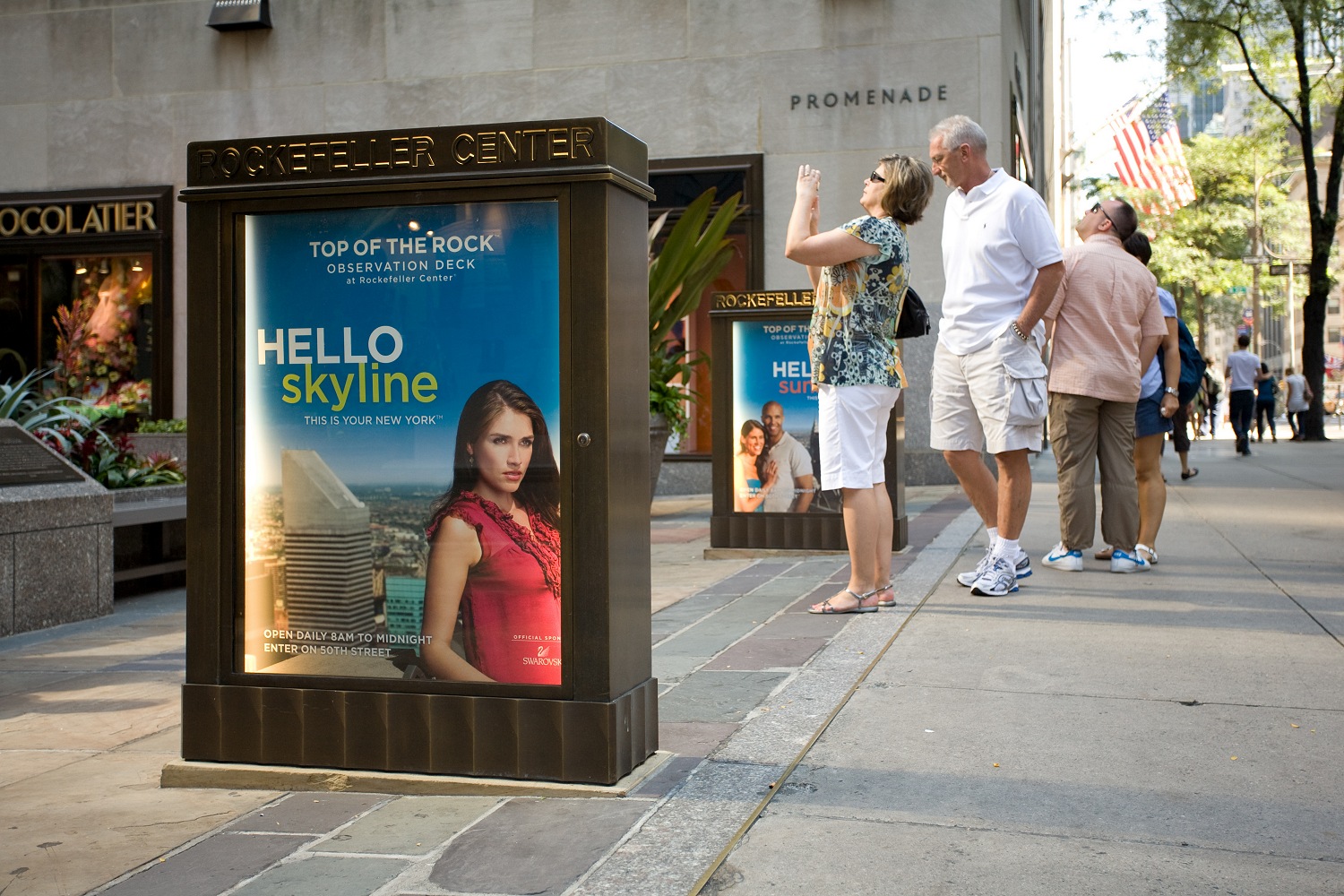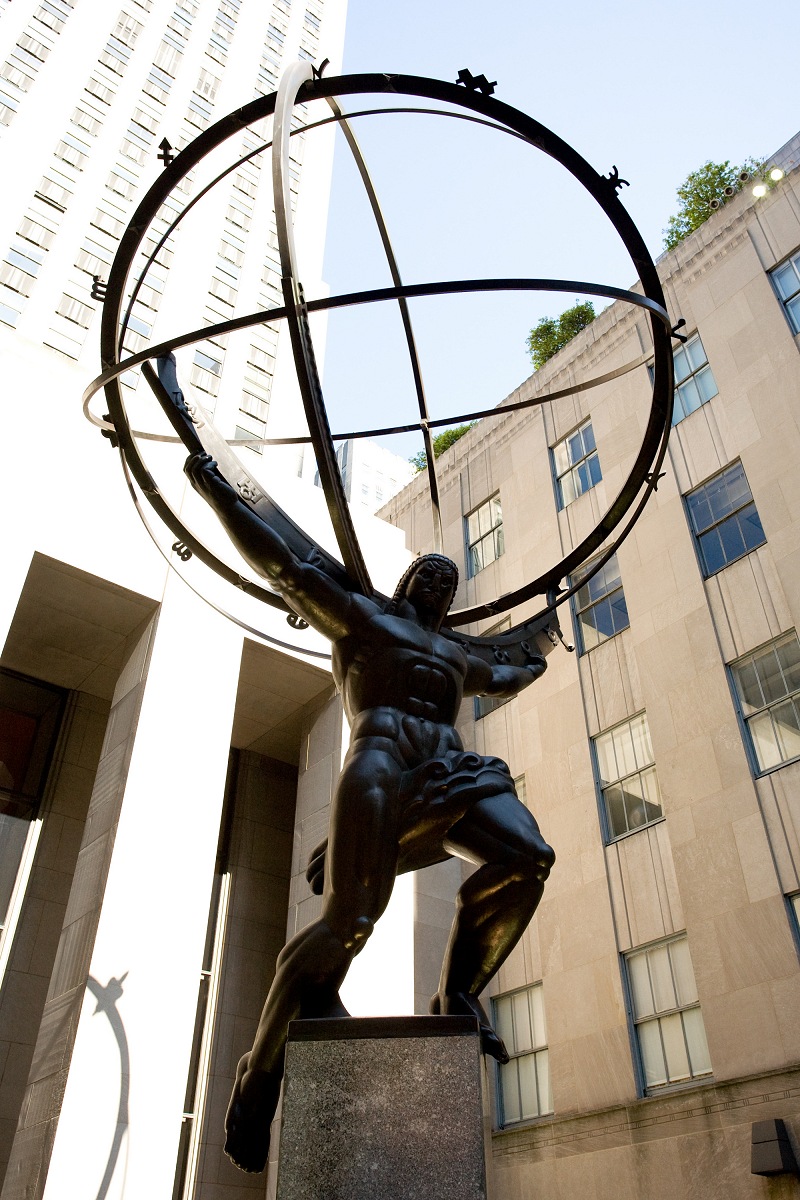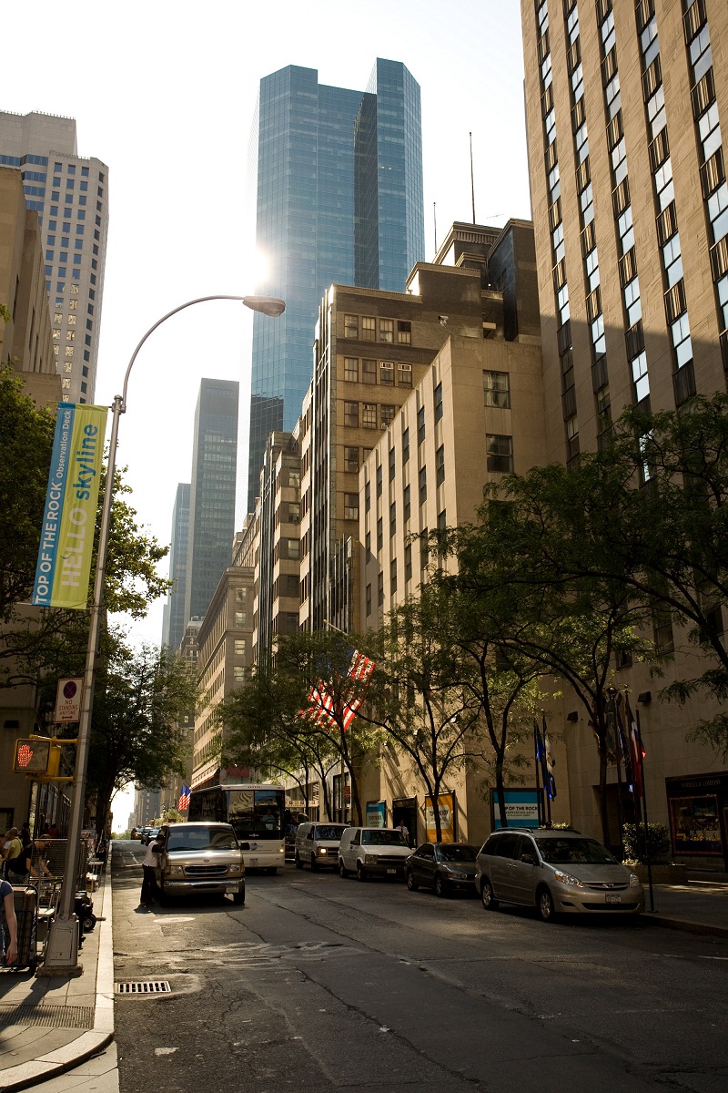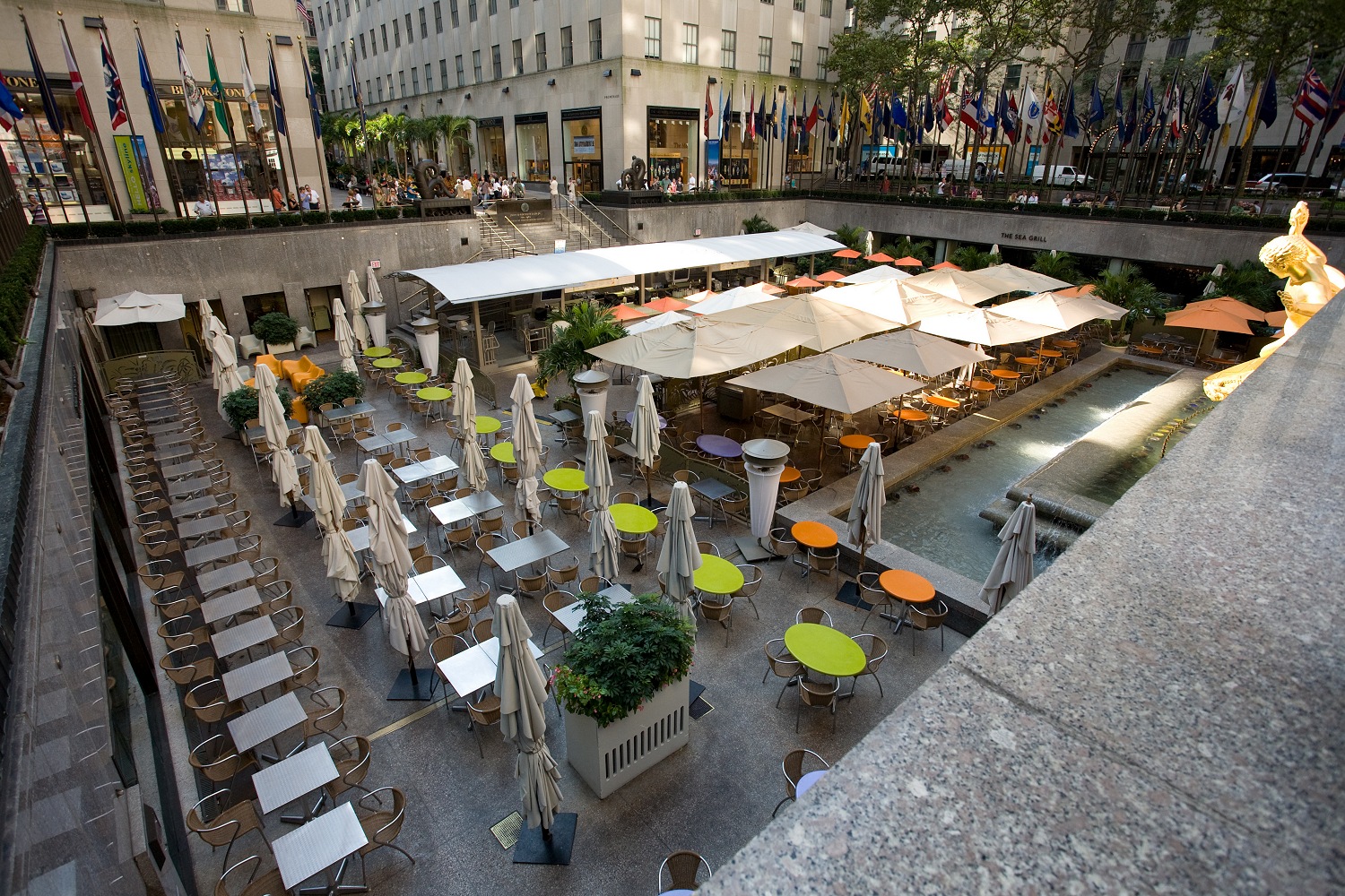 An unserem zweiten Morgen schliefen wir aus und standen erst kurz vor acht Uhr auf. Unserem gewohnten Bagel-Frühstück nebenan folgte ein Marsch zum Rockefeller Center, von wo aus wir weiter nach Norden aufbrechen wollten. Die untere Ebene des Rockefeller Plazas, wo bei unserem letzten Besuch gerade das berühmte Schlittschuhfeld aufgebaut wurde, war zum Café umfunktioniert worden. Bei solch schönem Wetter ist das natürlich das Naheliegenste.