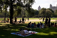 Die weiteren zwei Stunden verbrachten wir im Central Park, wo wir zuerst spazieren gingen und dann dem Treiben auf den großen Wiesen zusahen. Etwas überrascht waren wir, eine sehr schlanke, sportliche und gutaussehende blonde Frau in Begleitung eines nicht gerade schönen, stark übergewichtigen, geradezu gewaltigen Mannes zu sehen, der sich nach einiger Zeit als ihr Geliebter entpuppte. Entweder ist er vermögend oder es sind doch die inneren Werte, die zählen. Als er nach einem Päuschen wenige Meter zurückgelegt hatte, bückte er sich um einige Zentimeter und deutete eine Dehnung am, fing dann aber wie eine Dampflok an zu schnaufen. Seine feengleiche Freundin musste ihn daraufhin erst einmal streicheln und beruhigen, damit er nicht zusammenbrach.
