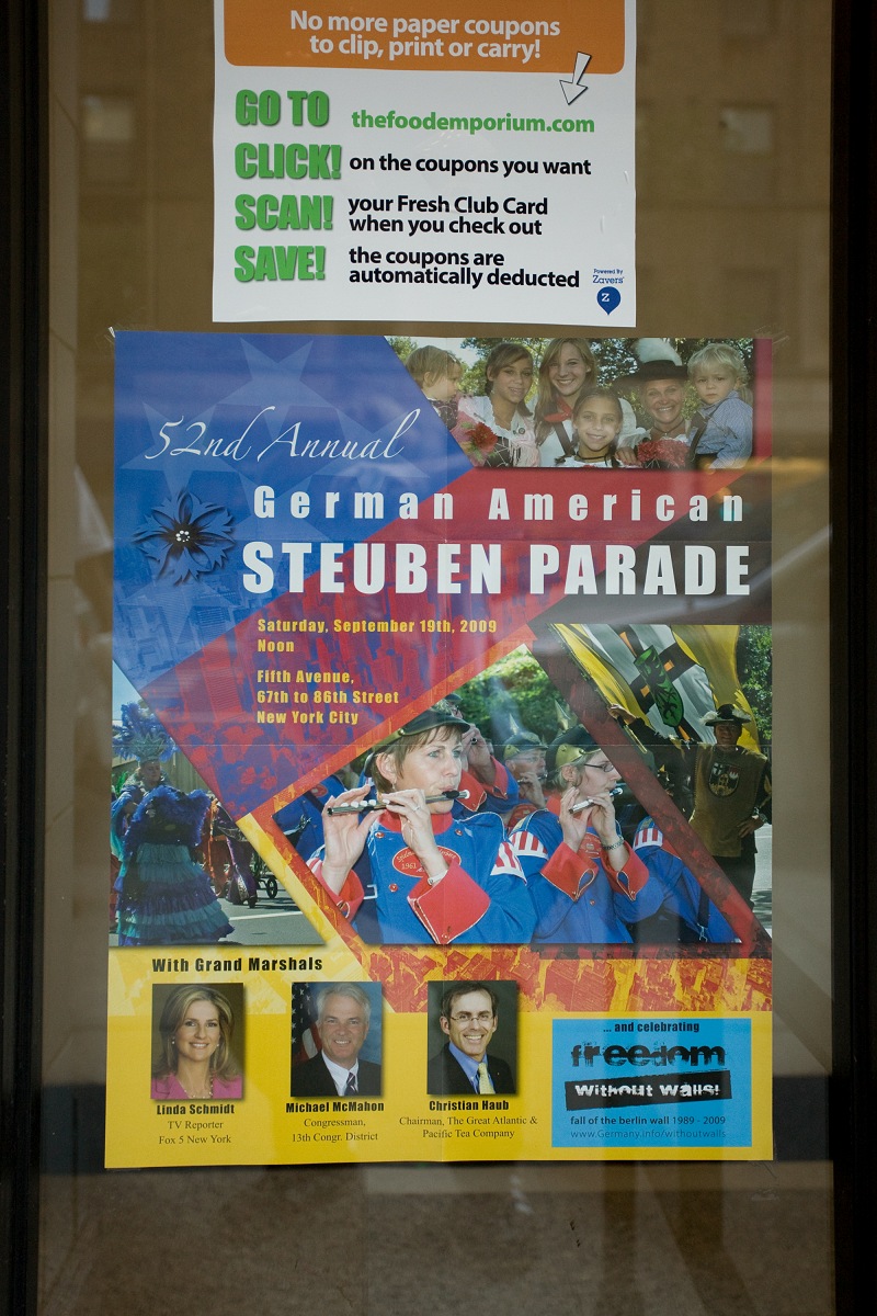 Bevor wir uns in die Warteschlange vor dem Guggenheim-Museum stellten, gingen wir noch etwas essen. J. und ich aßen gewöhnungsbedürftige Hamburger und S. etwas, das „Philly beef steak“ genannt wird und aussah wie fettiges Dönerfleisch in ein ebenso fettes Baguette gewickelt und wohl auch so schmeckte. Auf dem Weg sah ich ein Plakat der jährlichen Steuben-Parade, die von Deutschamerikanern zum Andenken an ihre Herkunft abgehalten wird.