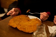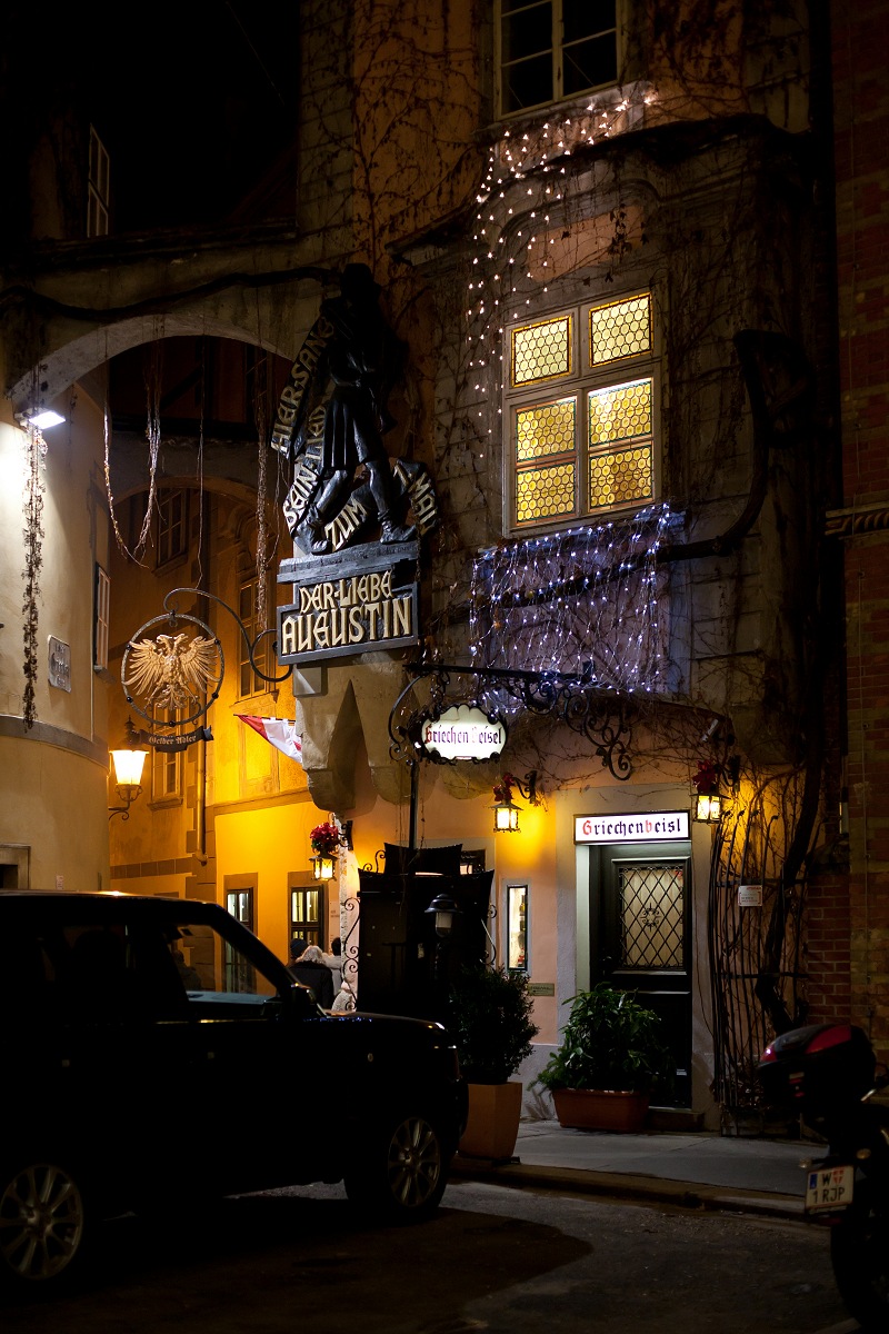 Um 20.30 Uhr konnten wir endlich unsere Plätze im Figlmüller in Beschlag nehmen. Unsere Reservierung erwies sich dabei als schlauer Einfall, da die Schlange vor dem Eingang mindestens fünf Meter betragen haben dürfte — eine Menge für einen so kleinen Schuppen. Zu unseren mehr als tellergroßen Wiener Schnitzeln bestellten wir gemischten Salat und Rösterdäpfel für J. und mich und Erdäpfel-Vogerlsalat für S. Eine Beilage weniger hätte es angesichts der gewaltigen Menge auch getan, die sich allein mit preußischer Disziplin gerade so bewältigen ließ. Unser Ober konnte seine Bewunderung ob dieser Leistung nicht verbergen. Ein voller Bauch marschiert nicht gern, also kullerten wir zurück ins Hotel.